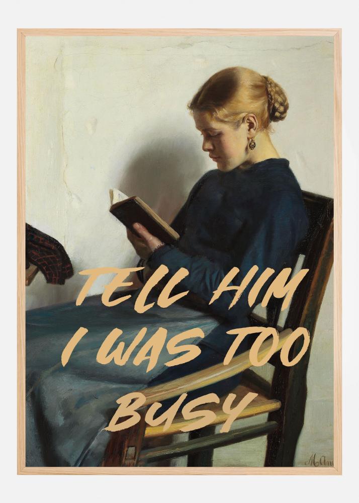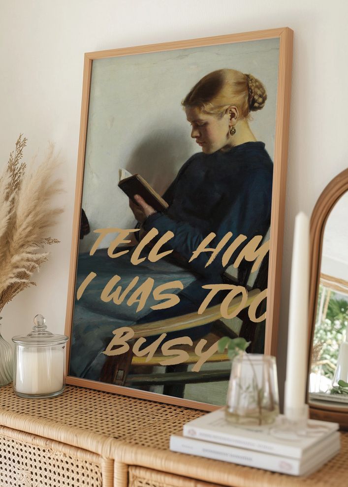 Denna poster fångar ögonblicket av en lugn stund med en kvinna som försjunken i en bok, vilket ger en känsla av avkoppling och introspektion. Texten "TELL HIM I WAS TOO BUSY" överlagras i en djärv, stilren typografi, som ger affischen en modern och unik twist. Detta motiv är perfekt för att skapa en rogivande atmosfär i vilket rum som helst och passar utmärkt i ett bibliotek, kontor eller vardagsrum.
