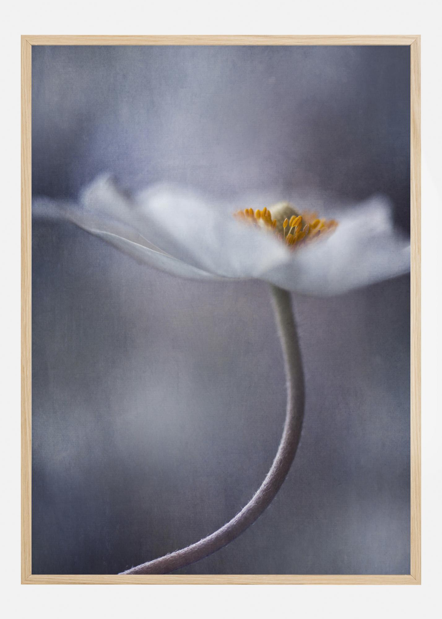 En blomsterposter med en närbild av en vit blomma mot en mjuk grå bakgrund. Blommans orangefärgade centrum sticker ut mot den dämpade bakgrunden, vilket skapar en ljus fokuspunkt och framhäver skönheten i blomman såväl som på utsidan. Den är eterisk och magisk och utstrålar frid.