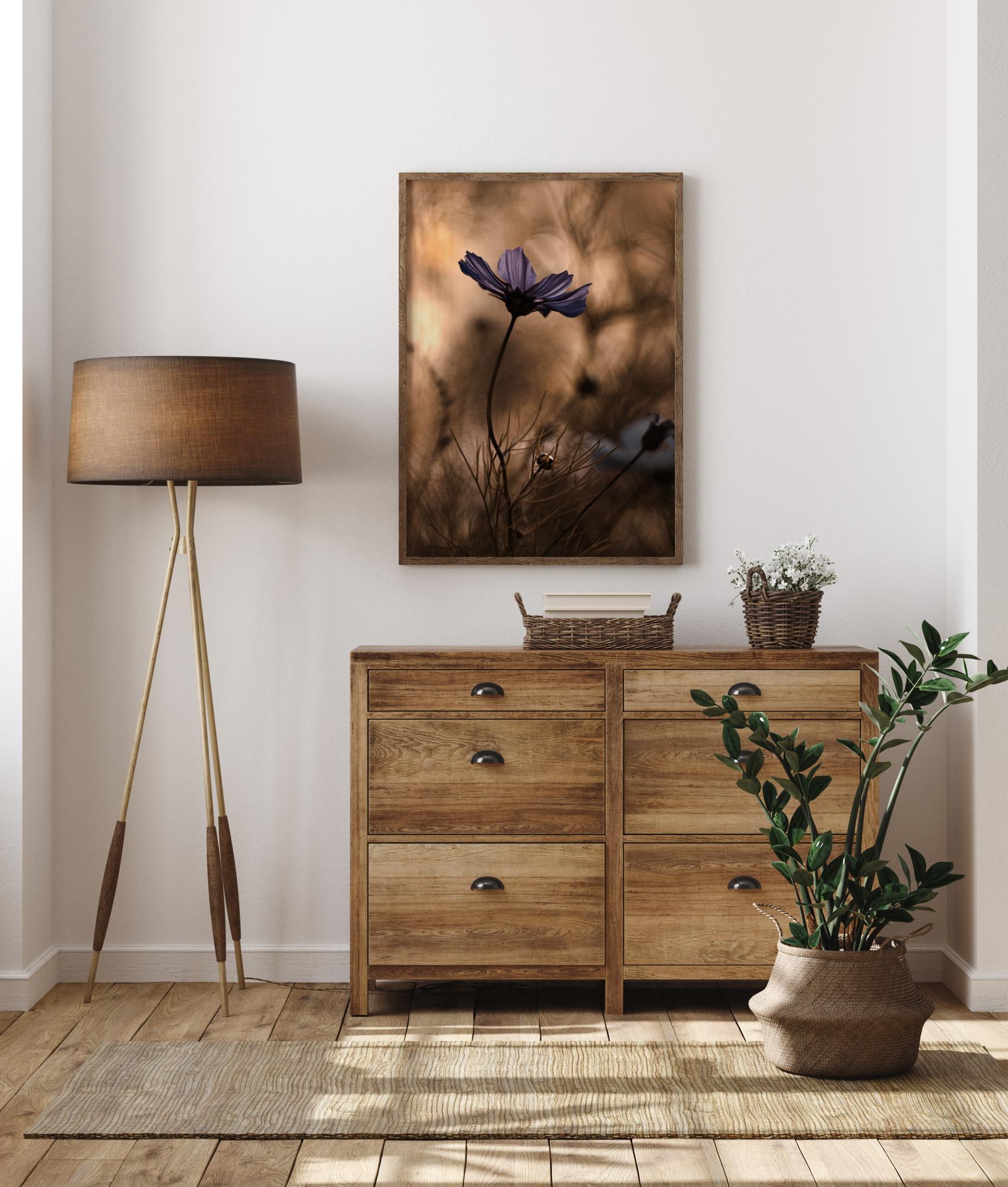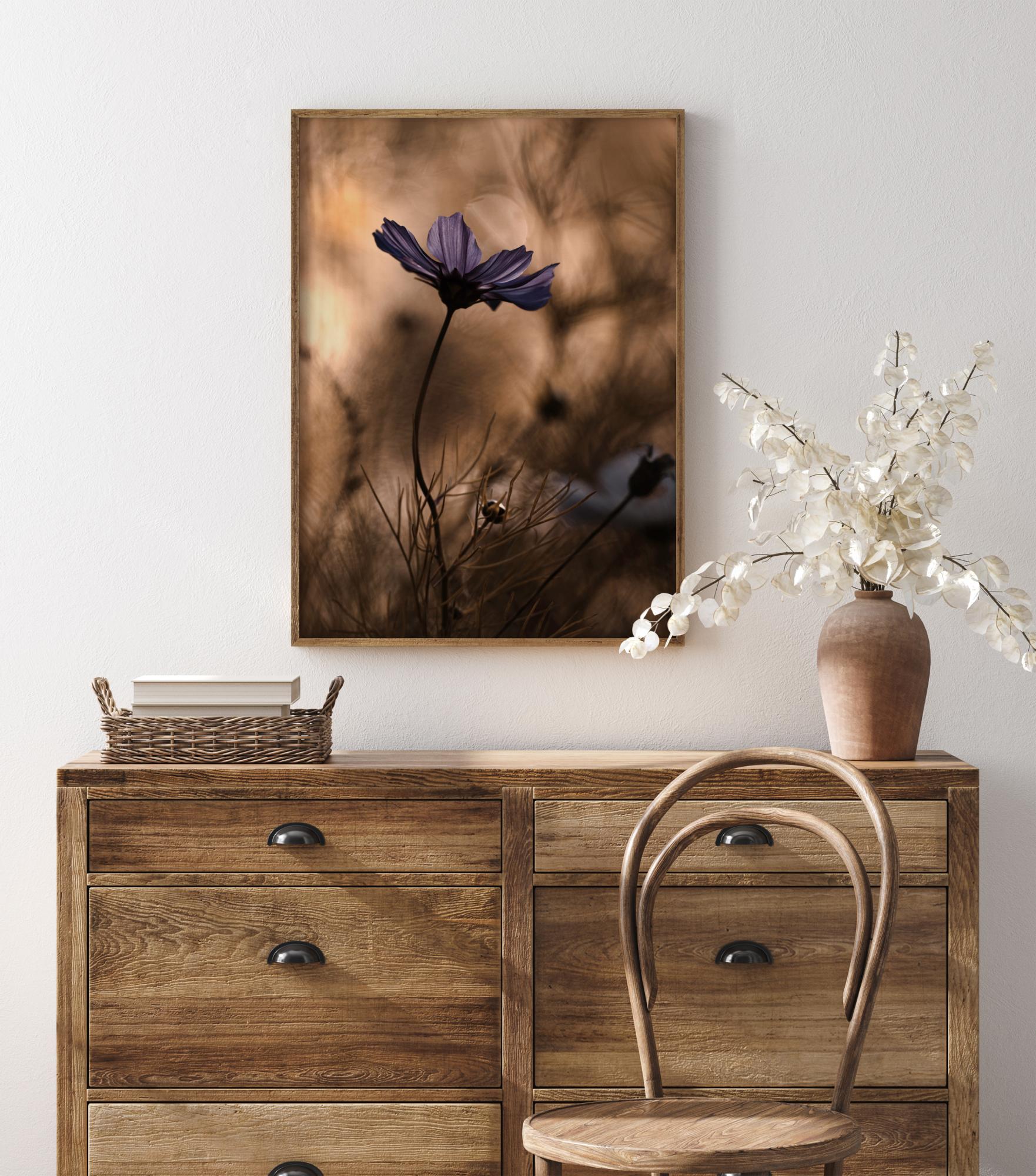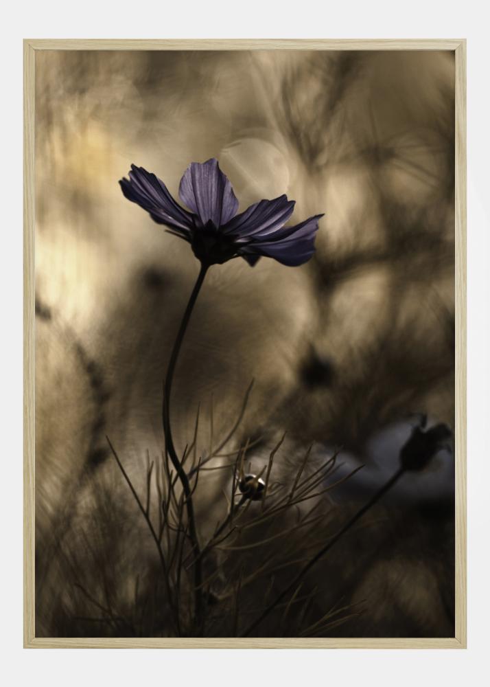 En blomsterposter med en ljuslila blomma som vajar mot en mjuk brun bakgrund. De lila kronbladen framhävs dramatiskt mot de ofokuserade växterna i bakgrunden. Andra former kan ses när blicken rör sig längs de böjda stjälkarna för att ta in hela bilden.