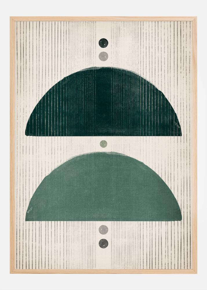 Denna affisch är mer än bara en dekorativ bild; den är en samtida konstnärlig tolkning som förenar det naturliga med det stiliserade. De tre cirkulära formerna, centrerade mellan de halvcirkelformade blocken, fungerar som ett fokus som för samman hela kompositionen. Den här printen skulle kunna tjäna som en elegant väggfunktion i ett minimalistiskt hem eller kontor, och de lugnande gröna tonerna skulle ge en känsla av natur och lugn till vilken miljö som helst.