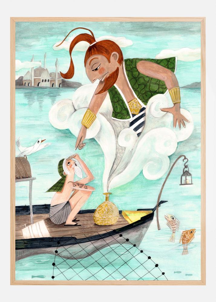 Färger i denna poster harmoniserar vackert, med toner av blått i himlen och vattnet som skapar en lugnande bas för hela kompositionen. Kontrasterande höjdpunkter av grönt, rosa, och gul, tillsammans med inslag av guld på figurernas accessoarer och detaljer, tillför värme och karaktär. Denna print är perfekt för den som önskar att ge liv åt sina väggar med en touch av mystik och färgrik lekfullhet. Oavsett om den placeras i ett vardagsrum, sovrum eller arbetsplats, kommer denna affisch säkerligen att locka blickar och tjäna som ett intressant samtalsämne.