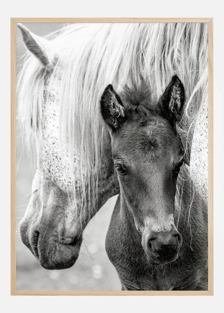 En djurposter med ett sto och hennes föl. Stoet skyddar sitt föl och lutar sitt vita huvud över dess rygg. Det mörkfärgade fölet tittar mot kameran från detta skydd, med öronen spetsade i nyfikenhet. Njut av denna söta babybild.