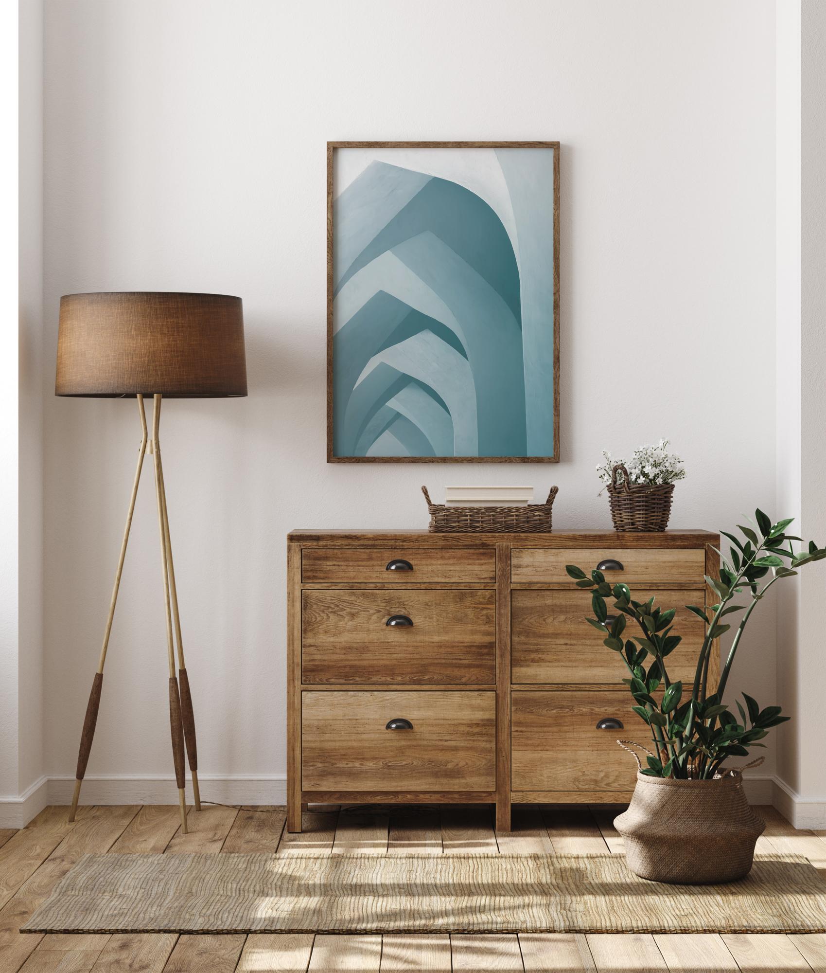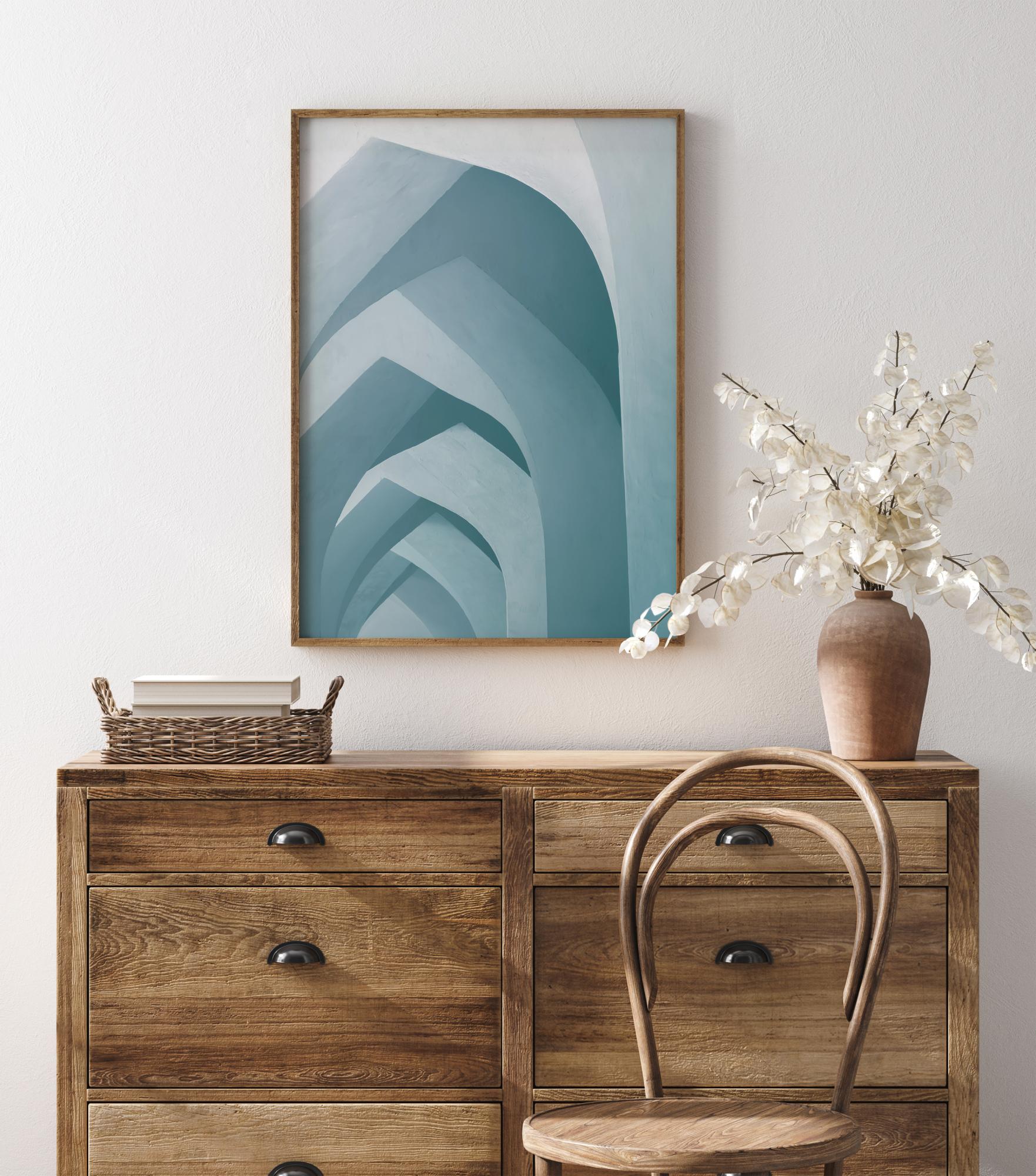 En grafisk poster med olika former som skapar bågar. Varje bågform skapas med hjälp av blockfärger i olika blå toner. Mörkt och ljust ställs mot varandra för att skapa en illusion av djup och känslan av en lång korridor. Häng denna på en vit vägg för att göra färgerna ännu mer kontrastrika.