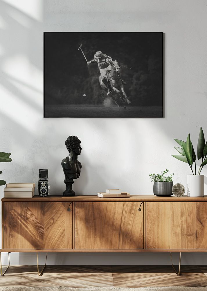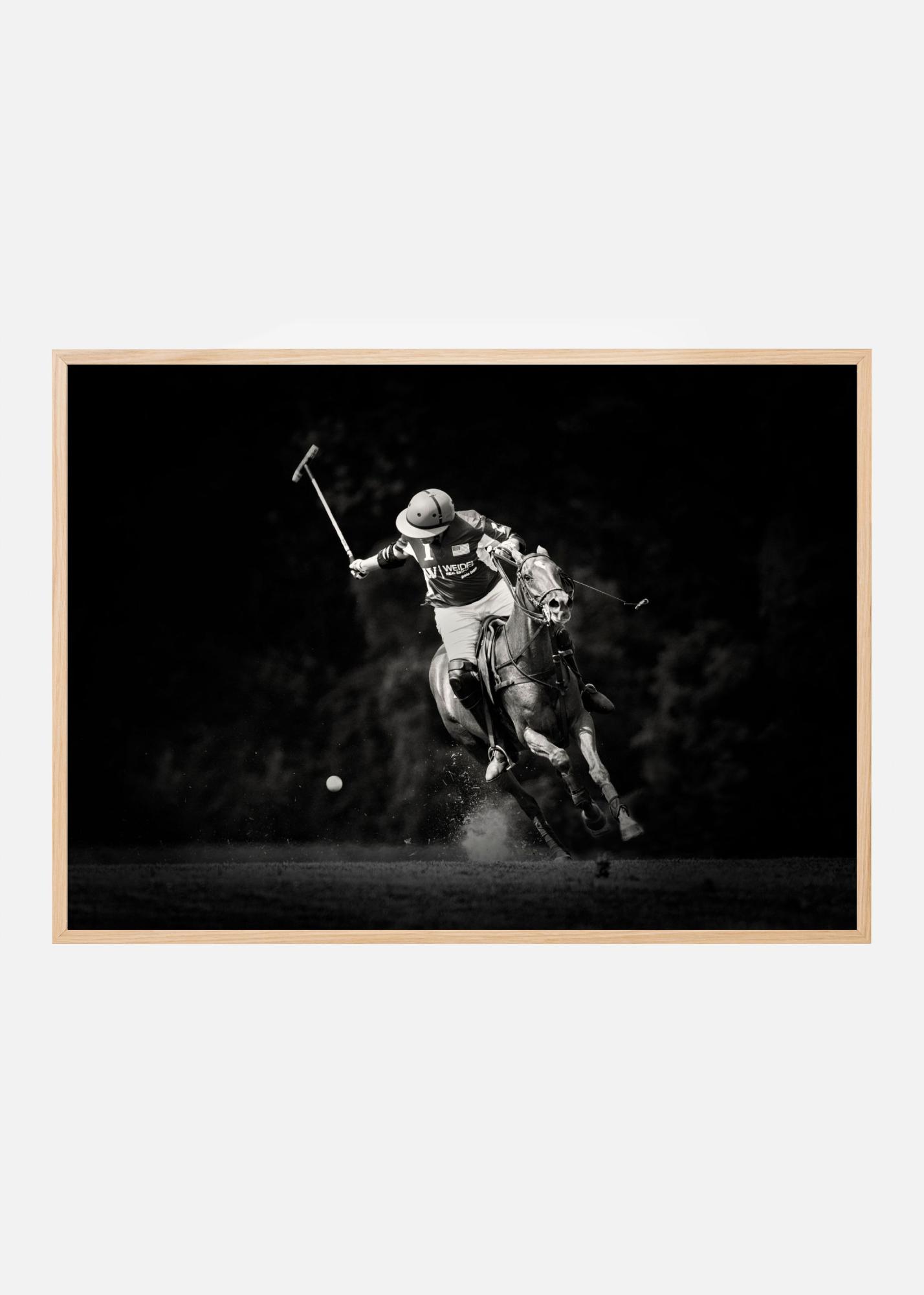 Denna stilrena poster fångar dramatiskt en polospelare i full fart på hästryggen, vilket ger en känsla av rörelse och energi. Motivet är i elegant svartvitt, vilket ger en tidlös och klassisk estetik som passar i många olika inredningsstilar. Det svartvita temat framhäver detaljerna i bilden, från polospelarens intensiva fokus till hästens kraftfulla rörelser.