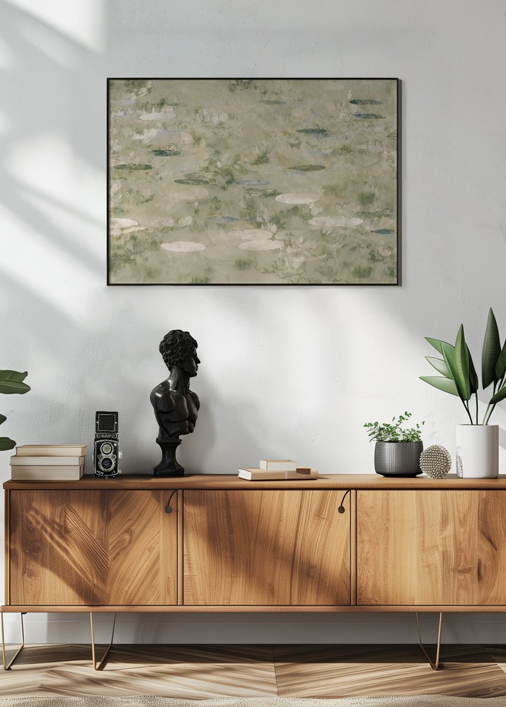 Denna eleganta poster fångar ett lugnande landskap med motiv av vatten och flytande näckrosor i en impressionistisk stil. Grönt är den dominerande färgen och blandas harmoniskt med inslag av mjuka vita och subtila blå nyanser. Detta konstnärliga print skapar en fridfull atmosfär, perfekt för att ge ditt hem en känsla av natur och harmoni.