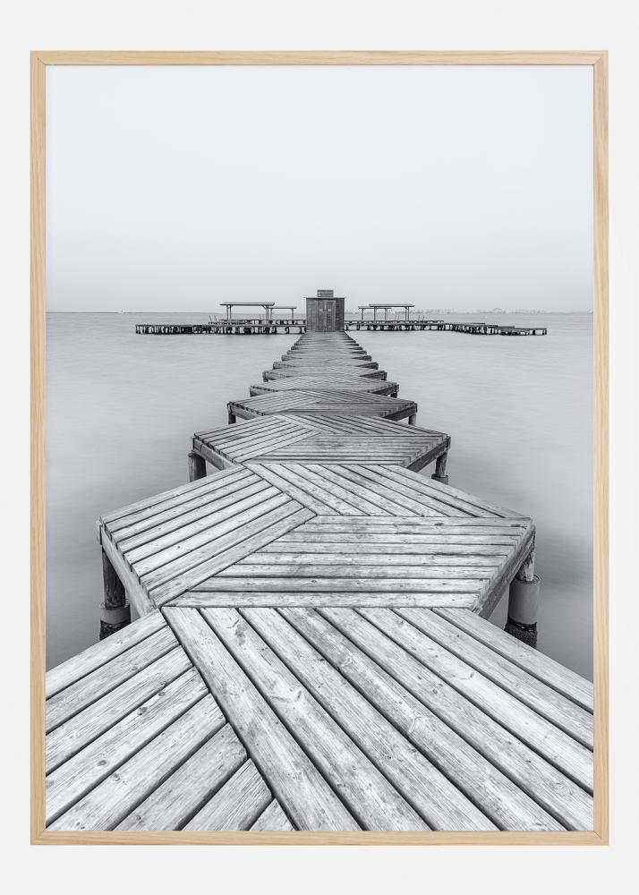 En rolig poster med en sexkantig pir som tar sig fram mot fjärran över en stilla sjö. Bilden är i dämpade gråtoner som gör att den ser kall snarare än varm ut. Träpiren leder dig ut i fjärran där det finns en brygga som väntar på dig. Kombinera med en ljus färg för att ge värme.