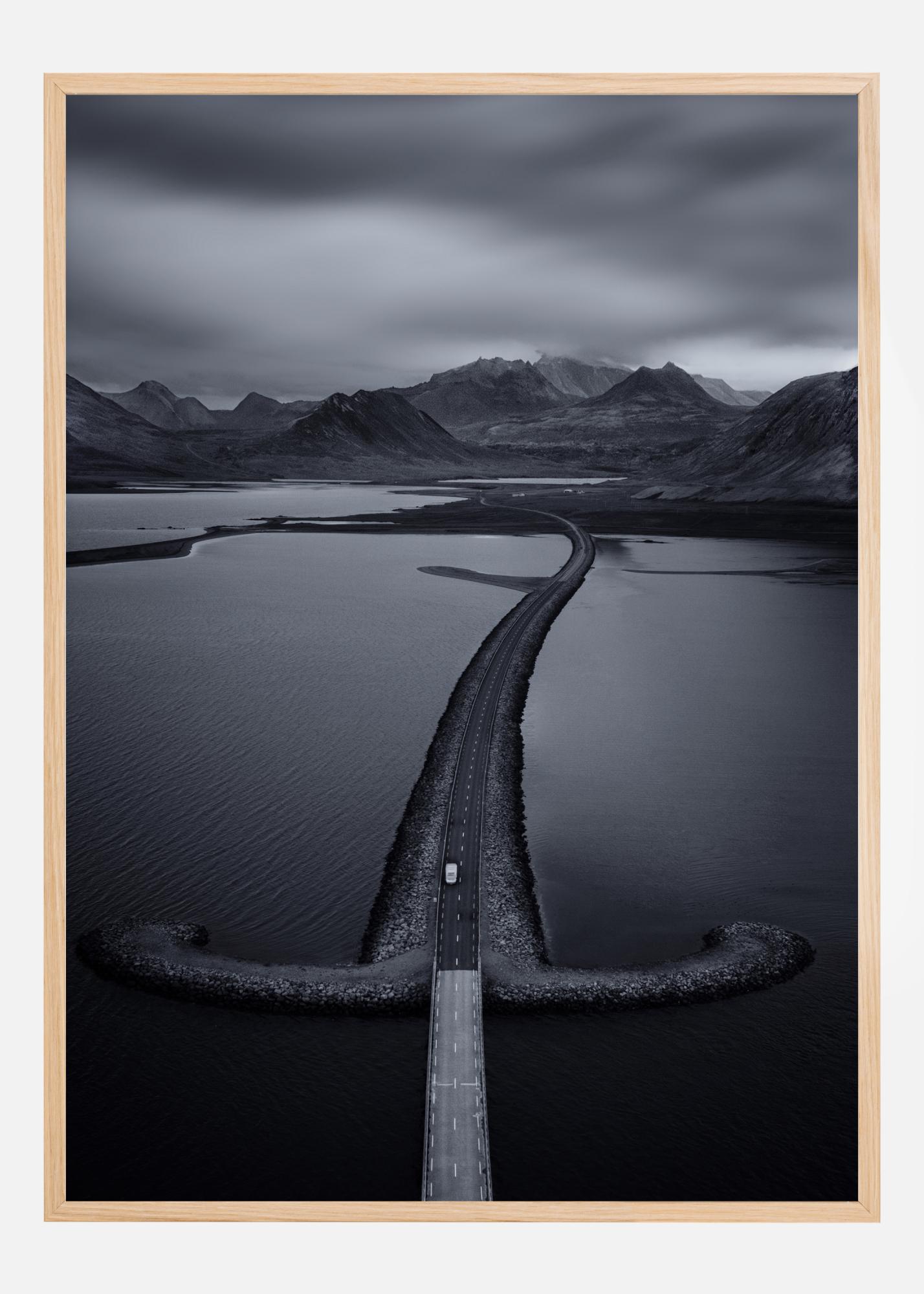 En poster i grå toner med en bred väg som går genom sjöar och in mellan bergen i bakgrunden. En grå molnig himmel hänger ovanför. En enda vit bil färdas på vägen mot fjärran. Kombinera med en ljus vägg för att ge lite färg åt den här strikta bilden.