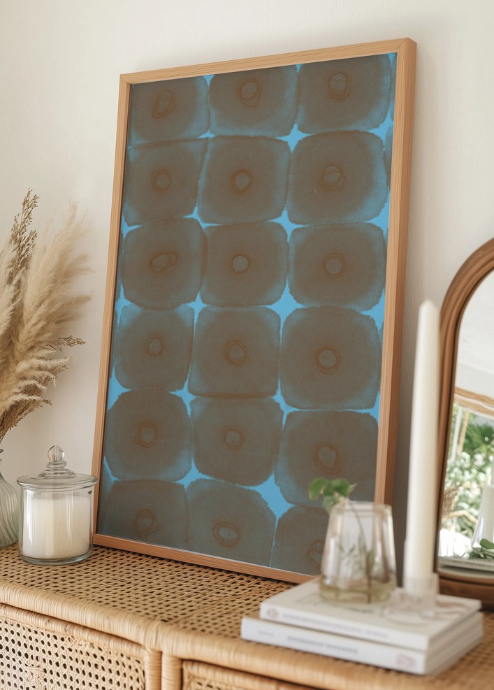 Motivet kännetecknas av sina lugna färgnyanser. De bruna kvadraterna står i kontrast mot en klarblå bakgrund, vilket framhäver varje detalj och tillför ett visuellt djup. Nyansen av brunt i kombination med den himmelsblå färgen ger ett lugnande och samtidigt spännande intryck, vilket gör denna print till ett utmärkt tillskott i varje rum där du vill skapa en rogivande atmosfär.