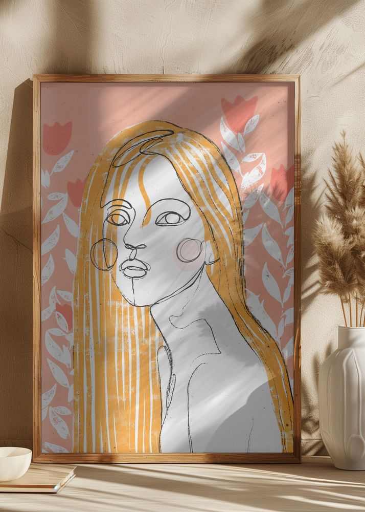 Upptäck elegansen i enkelheten med vår abstrakta affisch som framhäver en stiliserad kvinnlig silhuett. Denna konstnärliga print är en hyllning till modern konst, idealisk för att skapa en sofistikerad och samtida atmosfär i ditt hem. Med en grundfärg i en varm terrakotta ton, kompletterat av bladverk i mjukt vit och kontrasterande cerise detaljer, lyfter denna poster fram den ständigt populära skandinaviska designen och blir en punkt av intresse i varje rum.