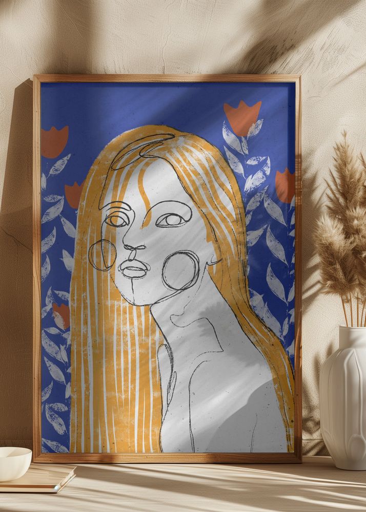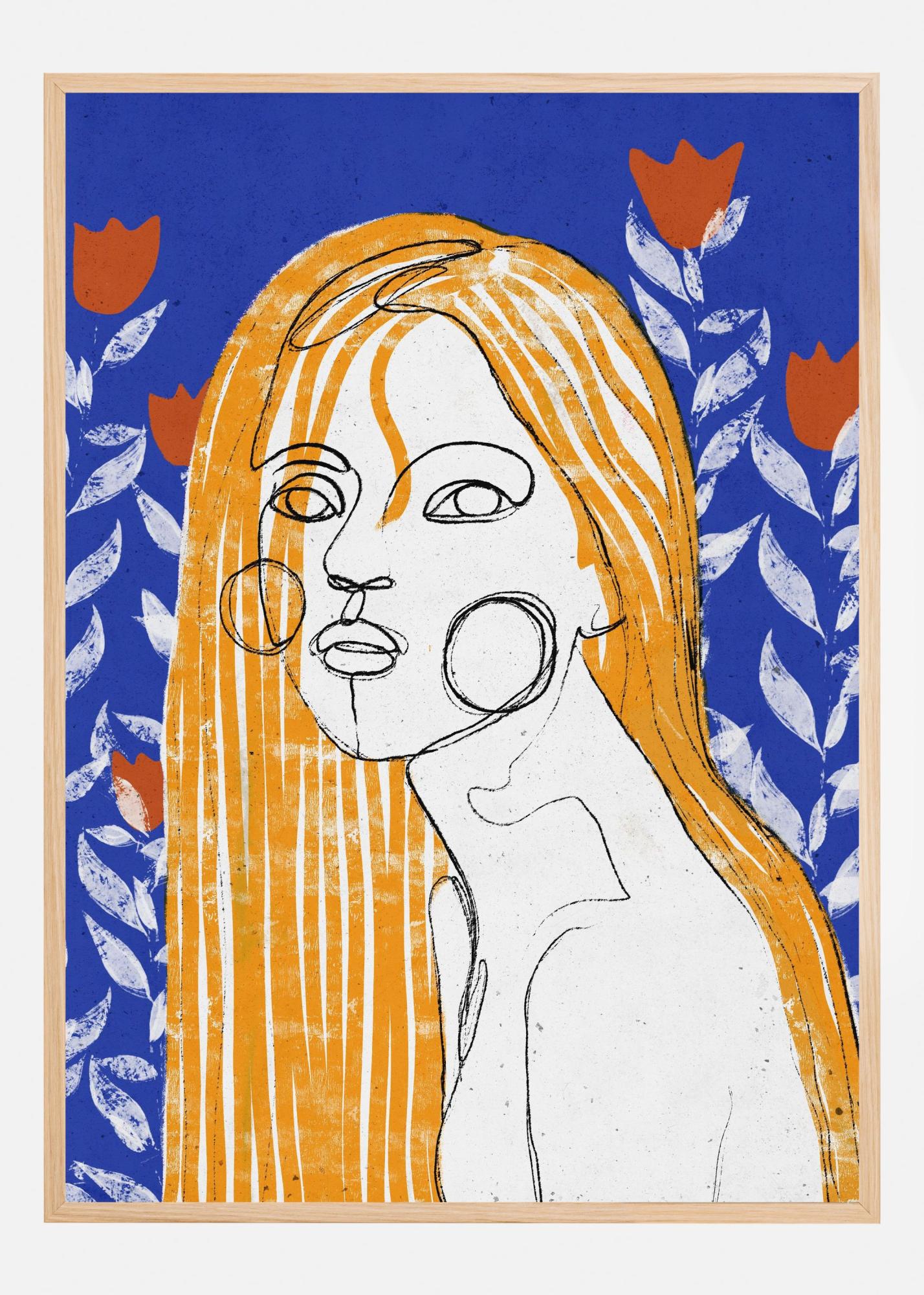 Denna konstnärliga affisch framhäver en stiliserad illustration av en kvinna med ett uttrycksfullt ansikte och markanta linjer. Kvinnans hår strömmar i en rik orange ton som ger en känsla av rörelse och livfullhet, medan huvudmotivet är omringat av ett mönster av eleganta bladverk i blått och omfamnas av charmerande blommor i en varm röd nyans högst upp i kompositionen. Denna moderna tolkning av porträtt är ett utmärkt val för den som söker en poster med personlighet och en samtida twist.