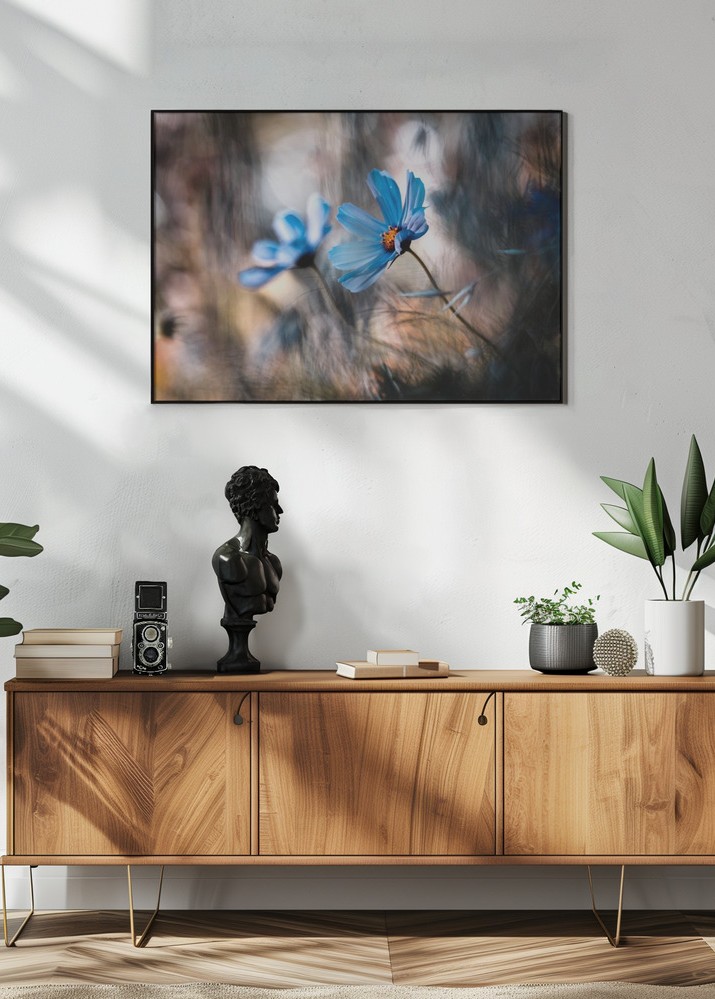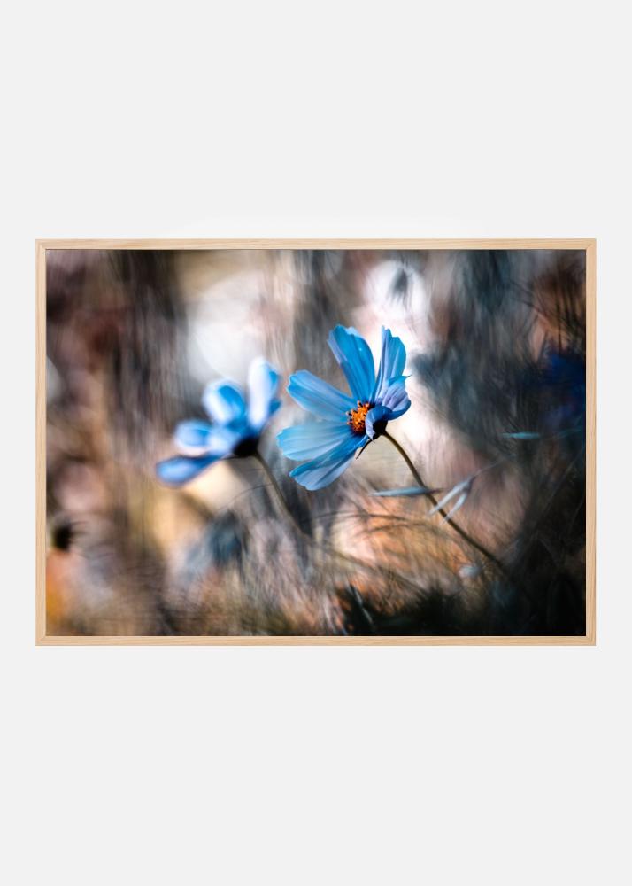 Denna poster fångar skönheten hos blomstrande blommor med en subtil och drömlik känsla. Motivet visar två blå blommor som står i fokus, omgivna av en mjukt oskarp bakgrund som ger verket en nästan magisk atmosfär. Perfekt för att ge liv och färg till vilket rum som helst, är denna affisch ett måste för alla som älskar naturinspirerade prints.