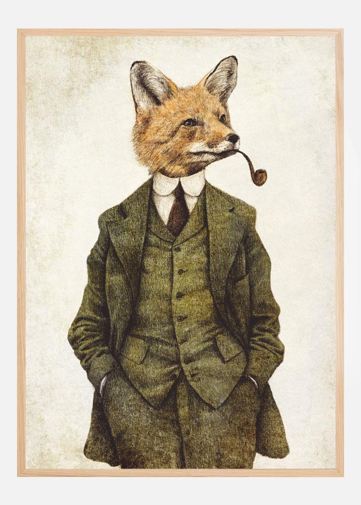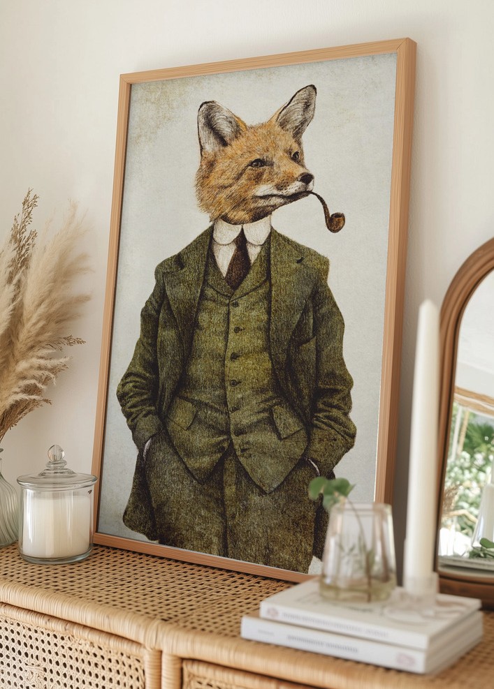Motivet är i varma jordnära färger med nyanser av dämpat grönt från kostymen, kombinerat med bruna och orange toner i rävens päls. Bakgrunden har en subtil beige ton som ger postern ett vintageintryck. Perfekt som en trendig affisch eller ett stilfullt print för att lägga till karaktär och stil i vilket rum som helst.