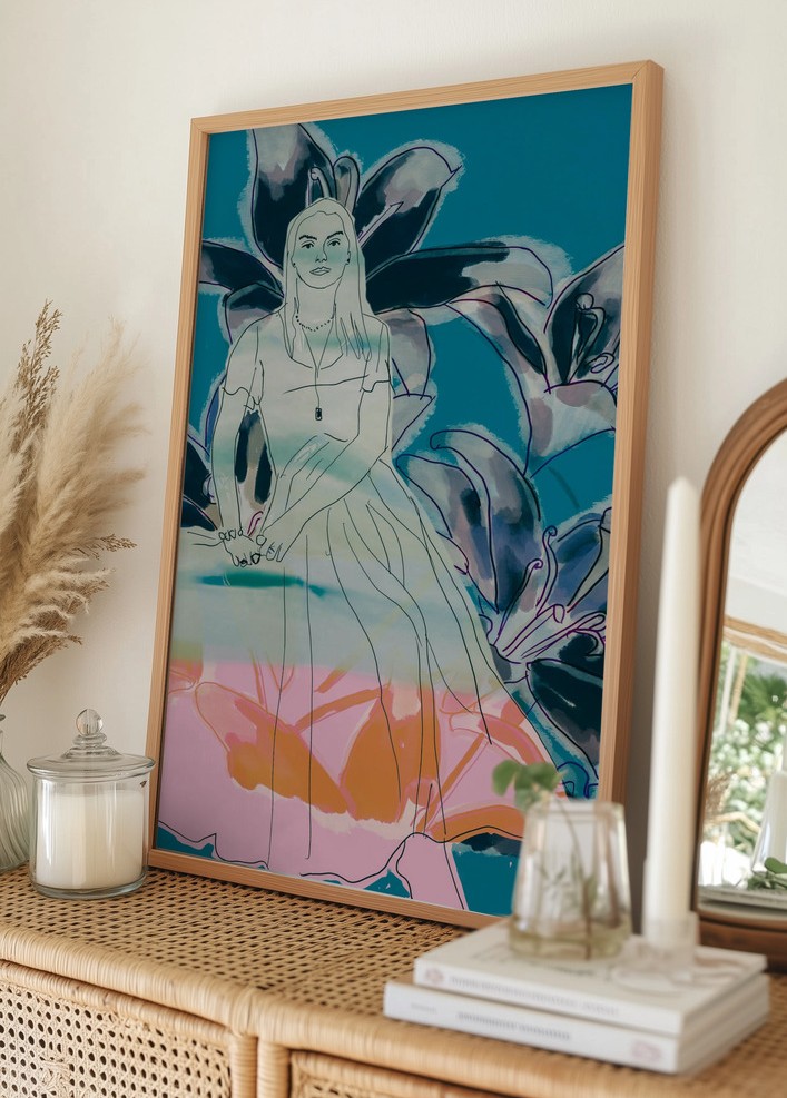 Färgpaletten i denna print är levande och inbjudande, med inslag av djup turkos och kontrasterande mörkblå toner. Värmen från rosa och orange nyanser skapar ett harmoniskt och iögonfallande uttryck, vilket kompletteras av subtila grå nyanser som ger djup och kontrast. Denna affisch tillför både energi och elegans till vilket rum som helst.