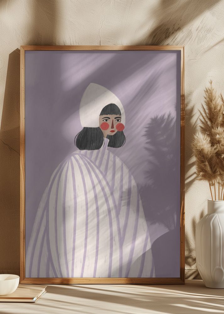 Upptäck vår unika poster som fångar essensen av en stillsam och stilren estetik. Motivet framställer en figur klädd i en randig vit och blekrosa mantel, som kontrasterar mot en lugn lavendelbakgrund. Figurens ansikte är avbildat med minimalistiska drag och ett par framträdande röda solglasögon som ger designen en modern och samtida känsla. Denna affisch är en perfekt inredningsdetalj för den som söker ett konstnärligt uttryck med en dov och harmonisk färgpalett.