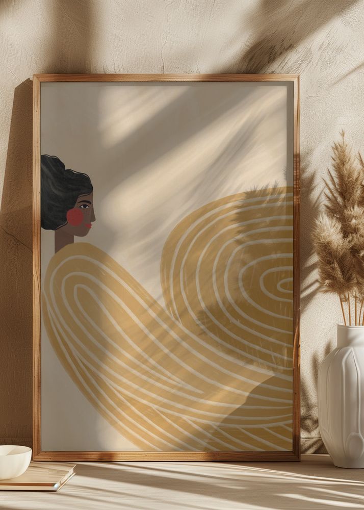 Denna stilfulla poster skapar en varm och inbjudande atmosfär i alla rum. Motivet visar en abstrakt komposition av svepande, vågiga linjer i en rogivande beige ton. Dessa linjer flödar runt och bakom en profil av en kvinna, vars ansikte delvis döljs av de organiska formerna. Hennes mörka hår står i kontrast mot den ljusa bakgrunden och lägger till en djupdimension till denna minimalistiska konst. De framträdande färgerna i denna affisch är nyanser av beige, guld och kaffe, kompletterade med en markant svart som framhäver kvinnans silhuett och en lekfull röd detalj av vad som verkar vara en örhänge som tillför en pop av färg.