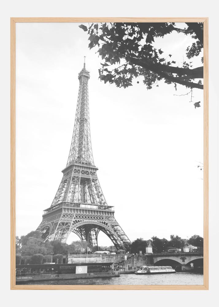 En stadsposter med Eiffeltornet i Paris. Det grå tornet syns tydligt mot en vit himmel. Nedanför syns flodens liv och rörelse med en båt och en bro. En trädgren skymmer nästan tornets topp i denna enkla, naturliga bild av detta ikoniska monument.
