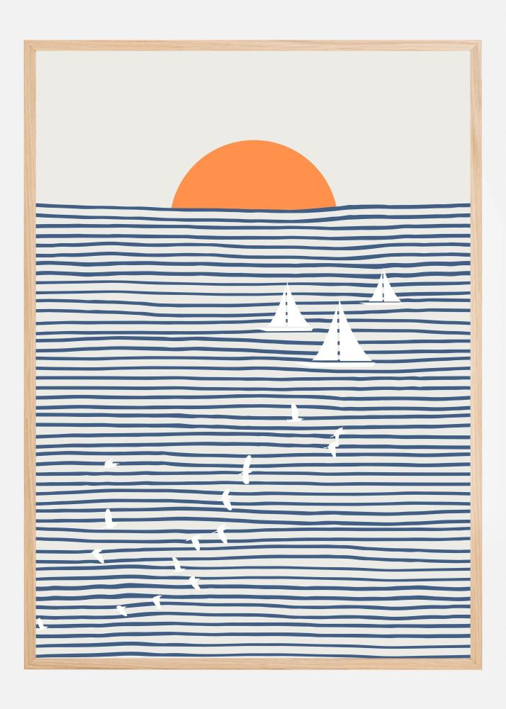 Denna maritima affisch bjuder in betraktaren till en vilsam stund vid havets kust. Kontrasten mellan de djupblå vågorna och den varma orange solnedgången skapar en harmonisk balans som påminner om skymningstimmen vid havet. Solen som vilar vid horisonten är en klassisk symbol för både slutet av en dag och hoppet om en ny morgondag. De vita segelbåtarna och måsarna adderar ett element av liv och rörelse till denna stilla scen, vilket gör denna print till ett perfekt komplement till varje hem som söker en sjöinspirerad atmosfär.