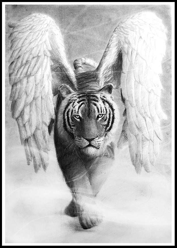 Har du en förkärlek för tigrar passar säkert denna vackra illustration föreställande en bevingad tiger som strövar omkring i ett himmelskt landskap perfekt! Sätt den gärna i en snygg ram med en enkel och slät profil.