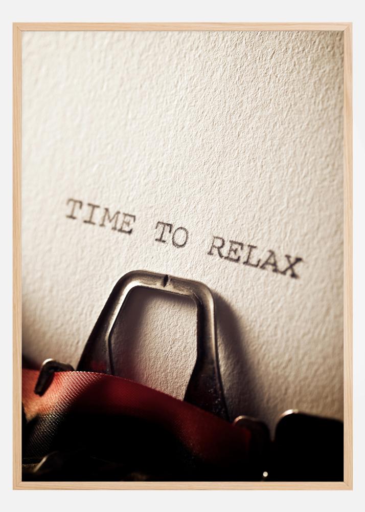 En textposter med budskapet "Time to relax" skrivet på en gammal skrivmaskin med sitt klassiska gamla typsnitt. En snygg och stilren poster med skön retrokänsla. Passar de flesta hem och inredningsstilar.