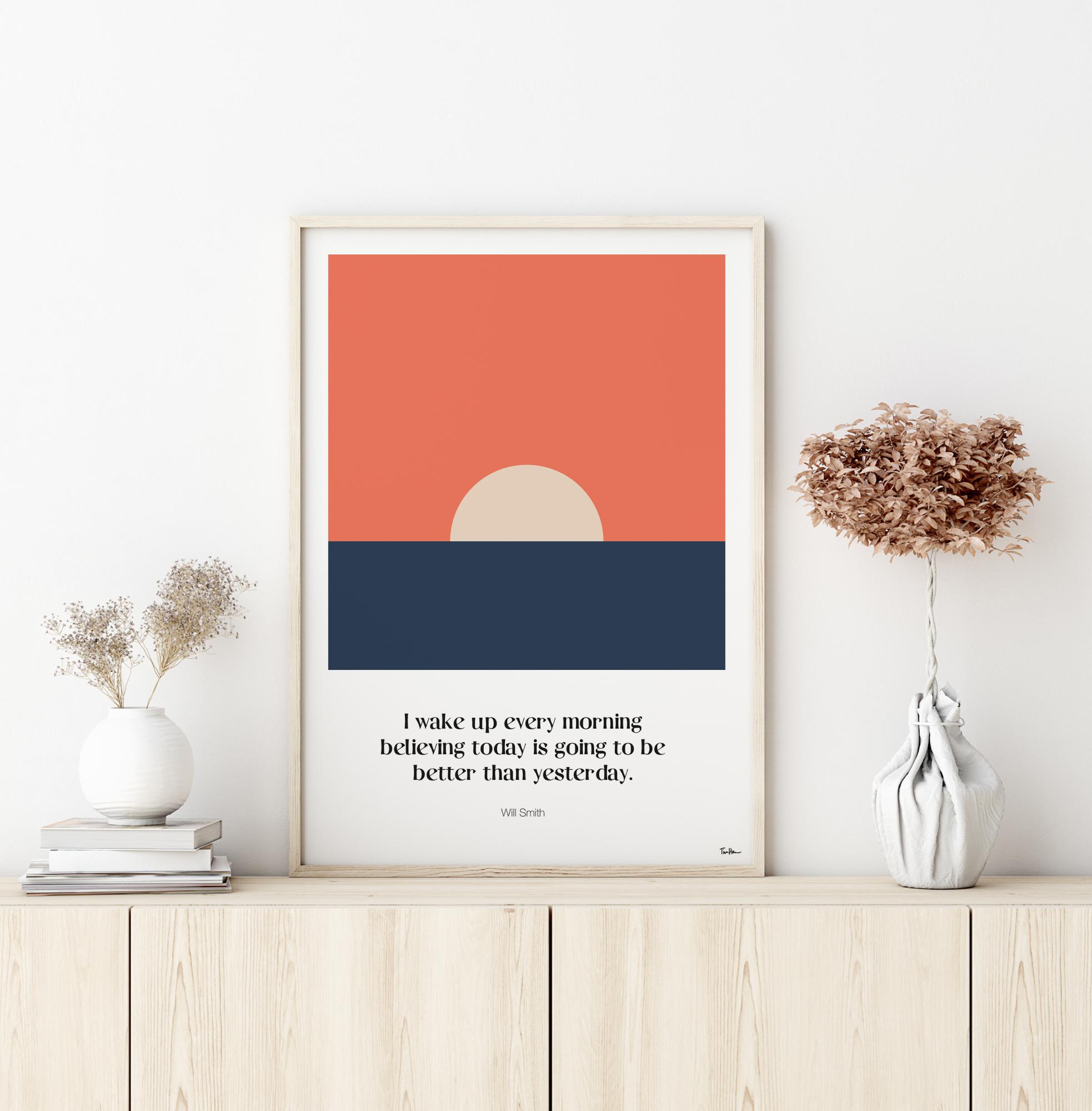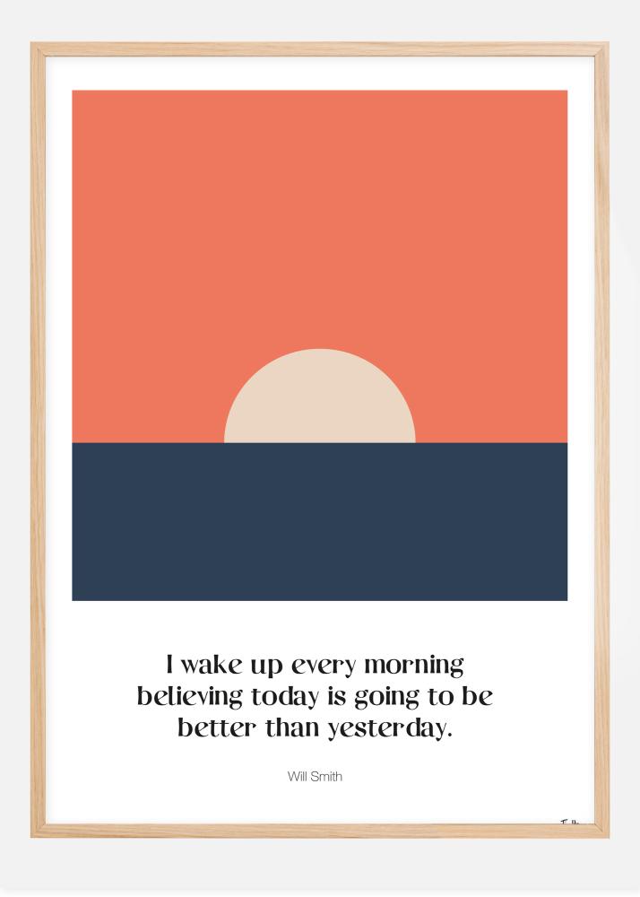 En textposter med Will Smiths citat "I wake up every morning believing today is going to be better than yesterday" skrivet under en grafisk illustration av en soluppgång. En snygg och stilren poster skapad av Tim Hansson.