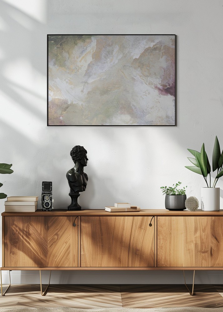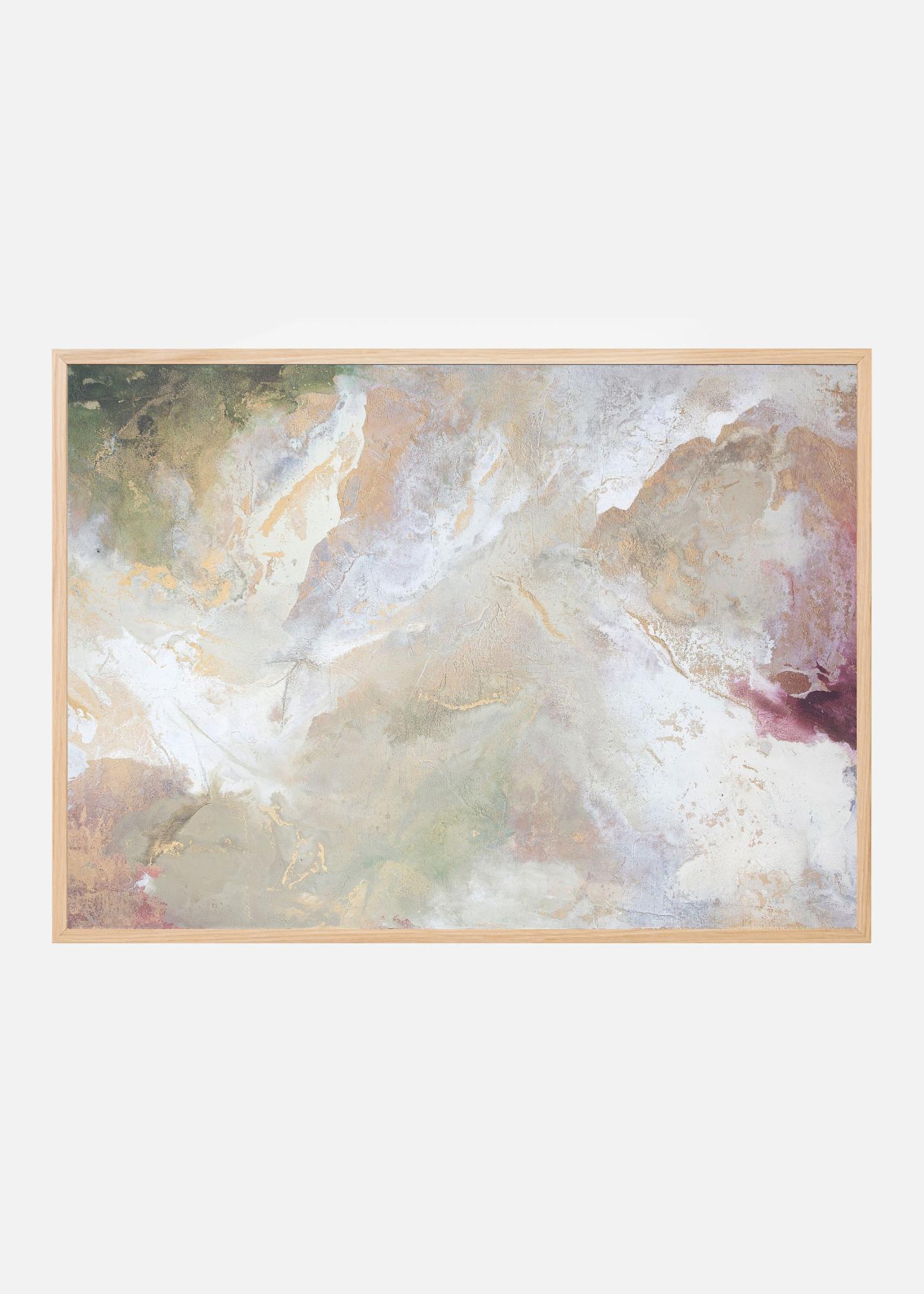 Denna eleganta affisch föreställer ett abstrakt landskap med mjuka färgövergångar som skapar en harmonisk känsla. Motivet domineras av naturliga toner som grönt, beige och guld, som tillsammans ger en lugnande och sofistikerad atmosfär. Perfekt som en poster i både kontors- och hemmiljöer, fungerar detta konstverk som en stilren inredningsdetalj.