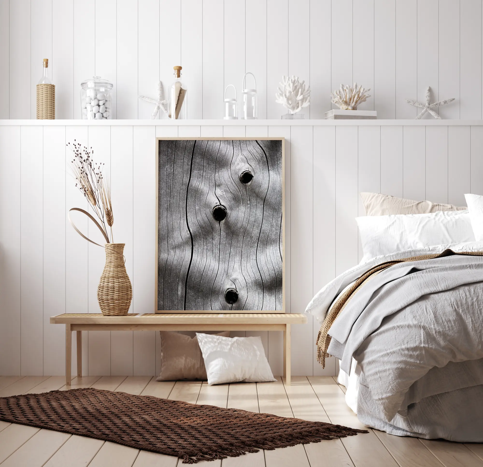En makroposter med en trädstam med tre hål i den. Träets korn är tydligt när lastbilens linjer väver sig uppåt. Tre mörka hål öppnas på olika ställen längs dessa linjer och ger stammen en känsla av textur. Häng upp den här bilden på en grön vägg för att få en mer naturlig känsla.