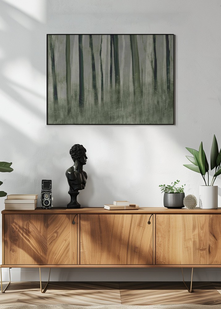 Denna affisch innehåller en palett av gröna nyanser som smälter samman med subtila inslag av grått och beige. Färgerna balanserar varandra och bidrar till ett fridfullt och balanserat uttryck. Perfekt för att skapa en meditativ hörna i ditt hem eller kontor, där du kan fly verkligheten en stund. Gör denna print till en del av din konstsamling och låt den tala till din fantasi varje dag.