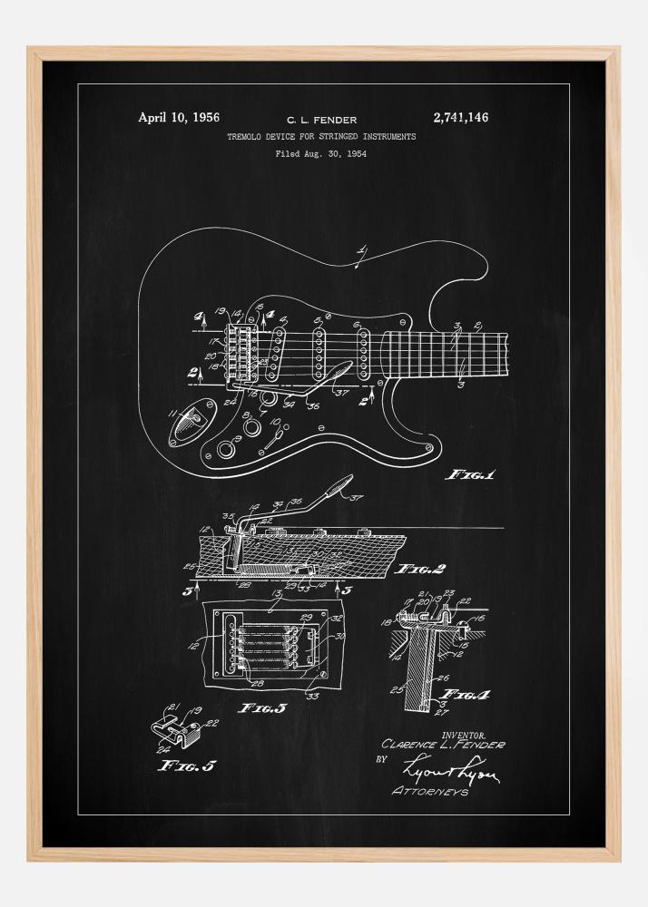 Med dess ursprungliga presentation på klassisk svart tavla, framhäver denna patentritning den banbrytande designen som förändrade sättet gitarrer spelades på. Patentet, som först lämnades in den 30 augusti 1954, illustreras med precision och omsorg, vilket skapar ett konstverk som är både informativt och inspirerande. En idealisk gåva för gitarrister, musikhistoriker eller de som uppskattar klassiskt hantverk, kommer denna affisch garanterat att vara en uppskattad del av varje samling.