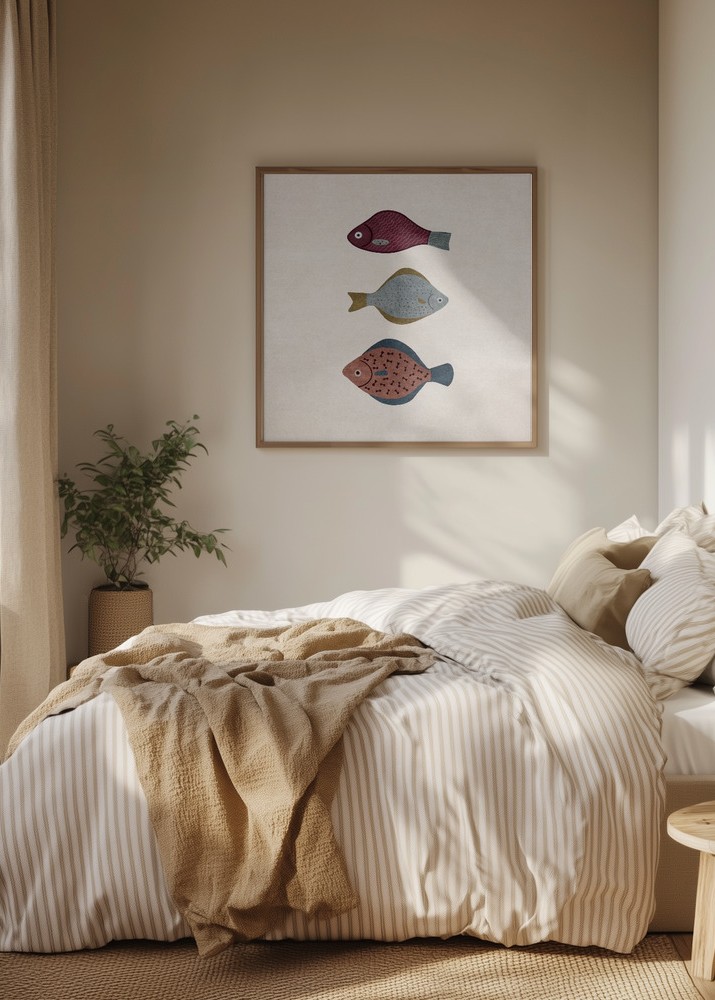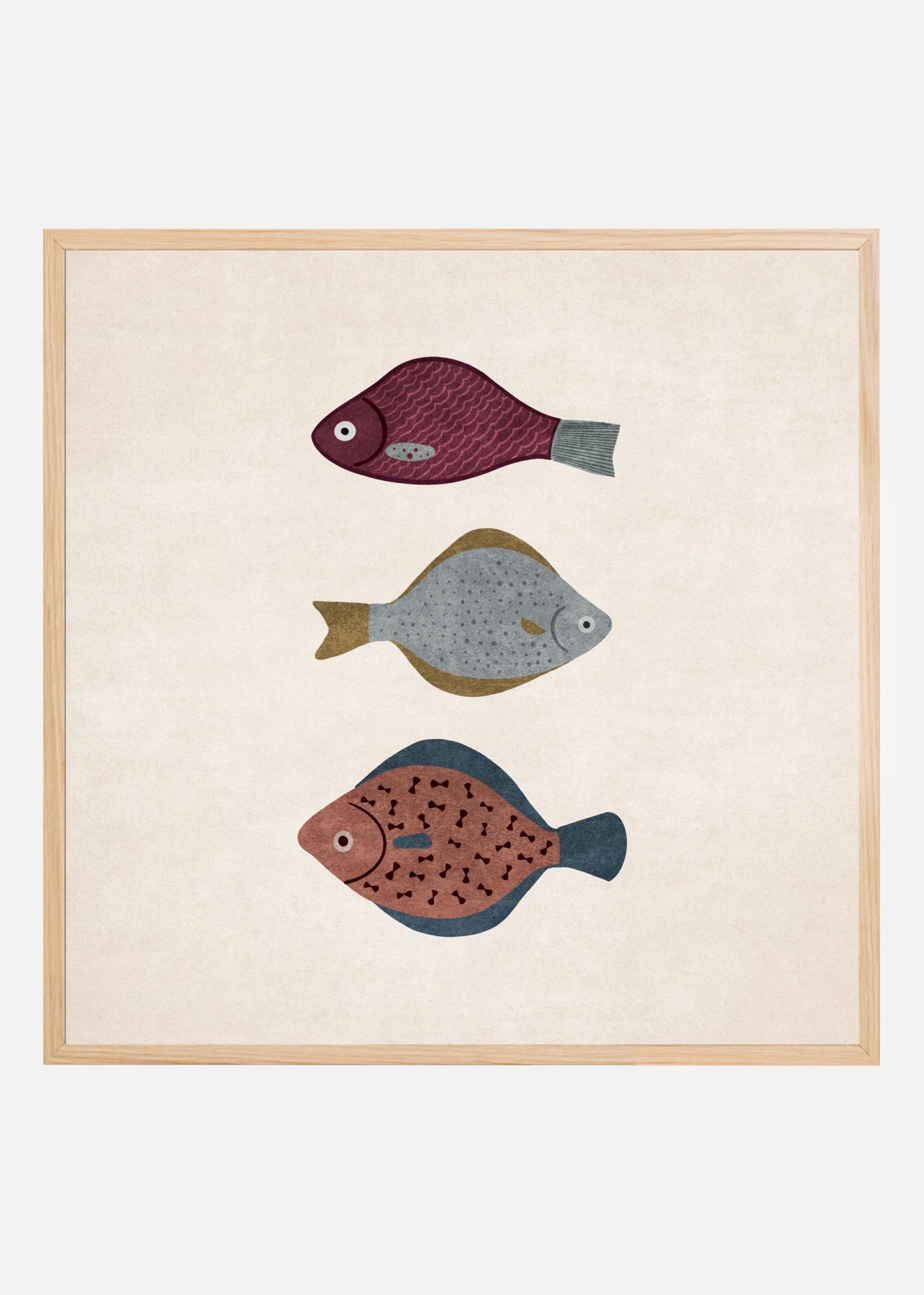 Denna trendiga poster erbjuder en charmig samling av tre stiliserade fiskar i olika färger och former. Motivet skapar en harmonisk och lugn känsla, perfekt för hemmet eller kontoret. Varje fisk har en unik design, vilket gör detta print till ett intressant samtalsämne och en visuell höjdpunkt i rummet. Med sina detaljerade mönster och dämpade toner, passar detta motiv utmärkt i en modern inredning.