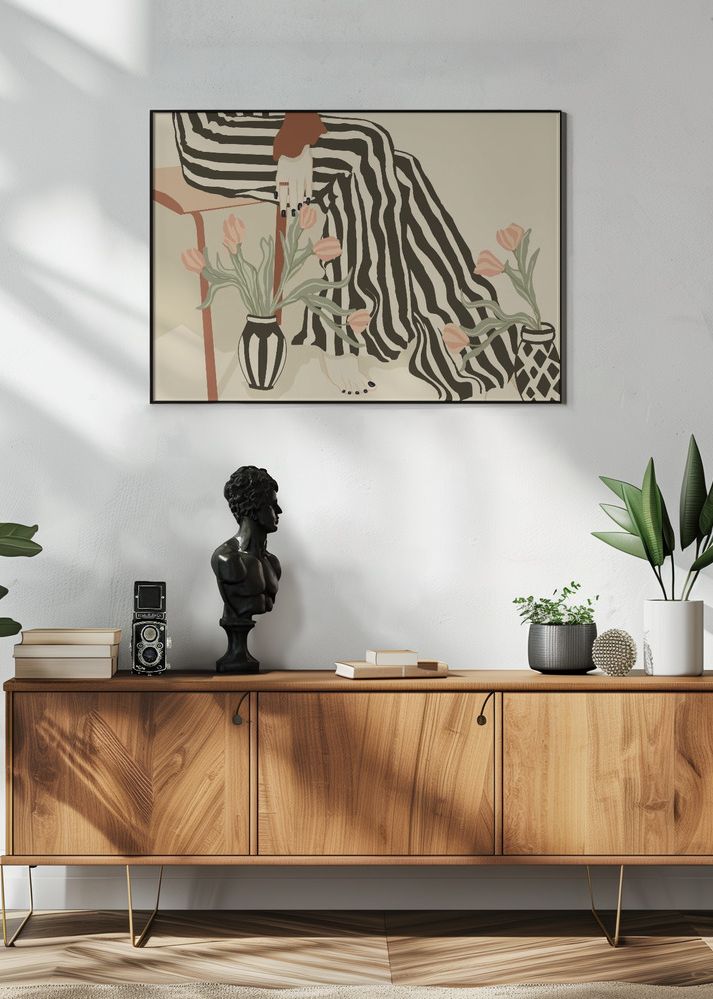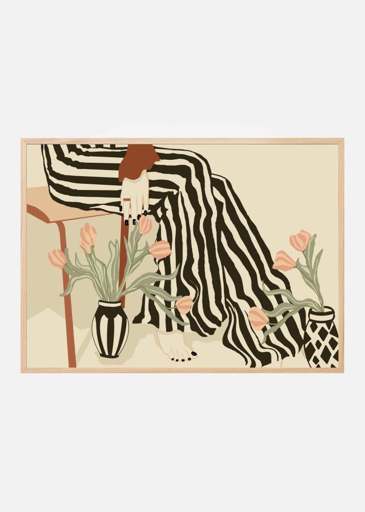 Denna poster fångar ett modernistiskt konstverk där en person med randiga byxor sitter avslappnat i en stol. Motivet kännetecknas av sina mjuka färger där jordnära toner dominerar. De svarta och beigea ränderna på byxorna skapar en harmonisk kontrast mot den ljusa bakgrunden, vilket ger en stilren och tidlös känsla. Två vaser fyllda med ljusrosa tulpaner pryder motivet, och de gröna stjälkarna lägger till en naturlig touch till affischen.