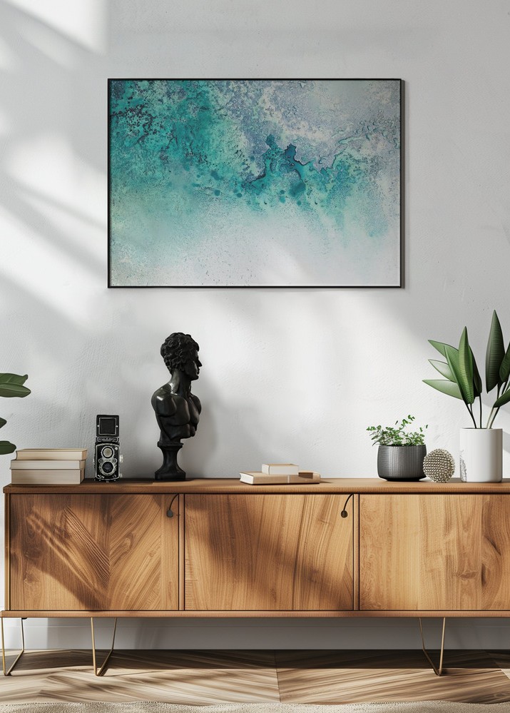 Affischen har inslag av grön, turkos och blå, vilket skapar ett harmoniskt och drömlikt landskap. Den abstrakta designen ger frihet till fantasin, vilket gör det till ett idealiskt tillskott i ditt hem eller kontor. Detta konstverk är mer än bara en affisch; det är ett uttryck för stil och elegans som kompletterar vilket utrymme som helst.