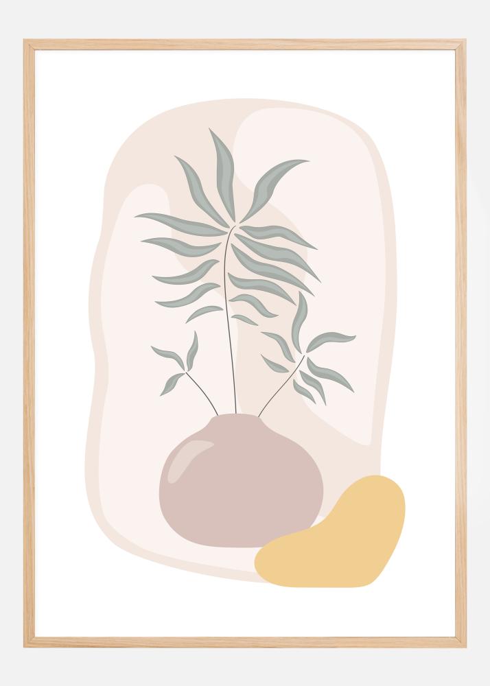 En stiliserad poster med en vas med en grön växt som poppar ut ur den. Andra märkliga former och färger fyller bakgrunden och gör detta till ett intressant men något abstrakt verk. Matcha med en teckning i liknande stil för att skapa ett eget minigalleri hemma.