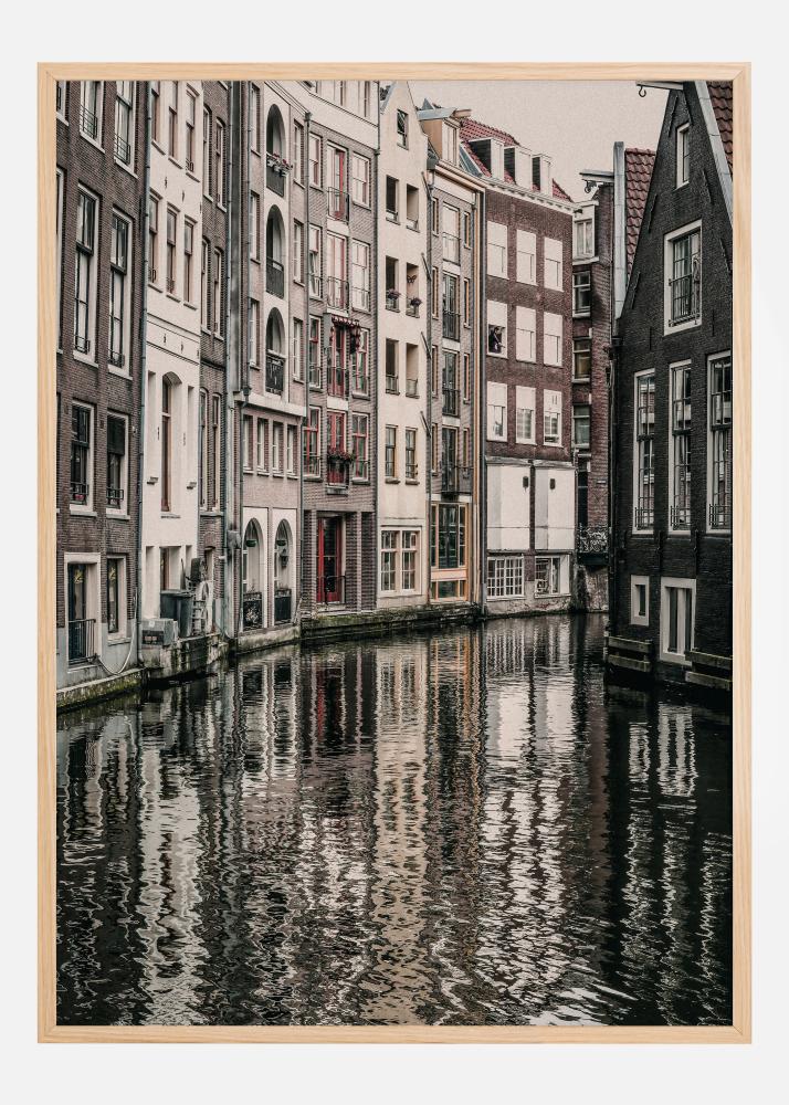 En stadsbildsposter med en kanal som går genom rader av höga stadshus. Detta sepiatryck har bara några få nyanser av rött och mjuka bruna färger för att skapa fokuspunkter. Husen vilar vid vattenkanten och kastar sina skuggor på den porlande ytan. Hitta matchande beigefärgade färger till väggen för att göra husens färger skarpare.