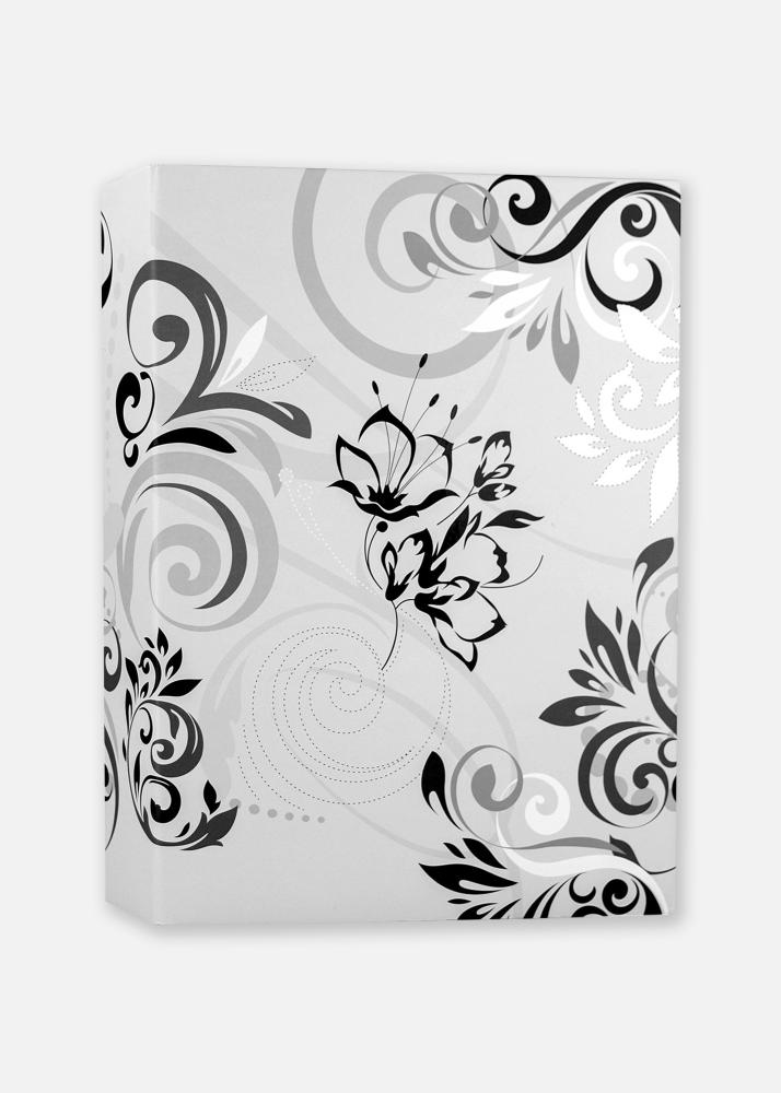 Albumet har kraftiga pärmar med ett stilfullt blommönster i svart och grått. Det är ett dekorativt fotoalbum som gör sig fint både i hyllan och liggandes framme.