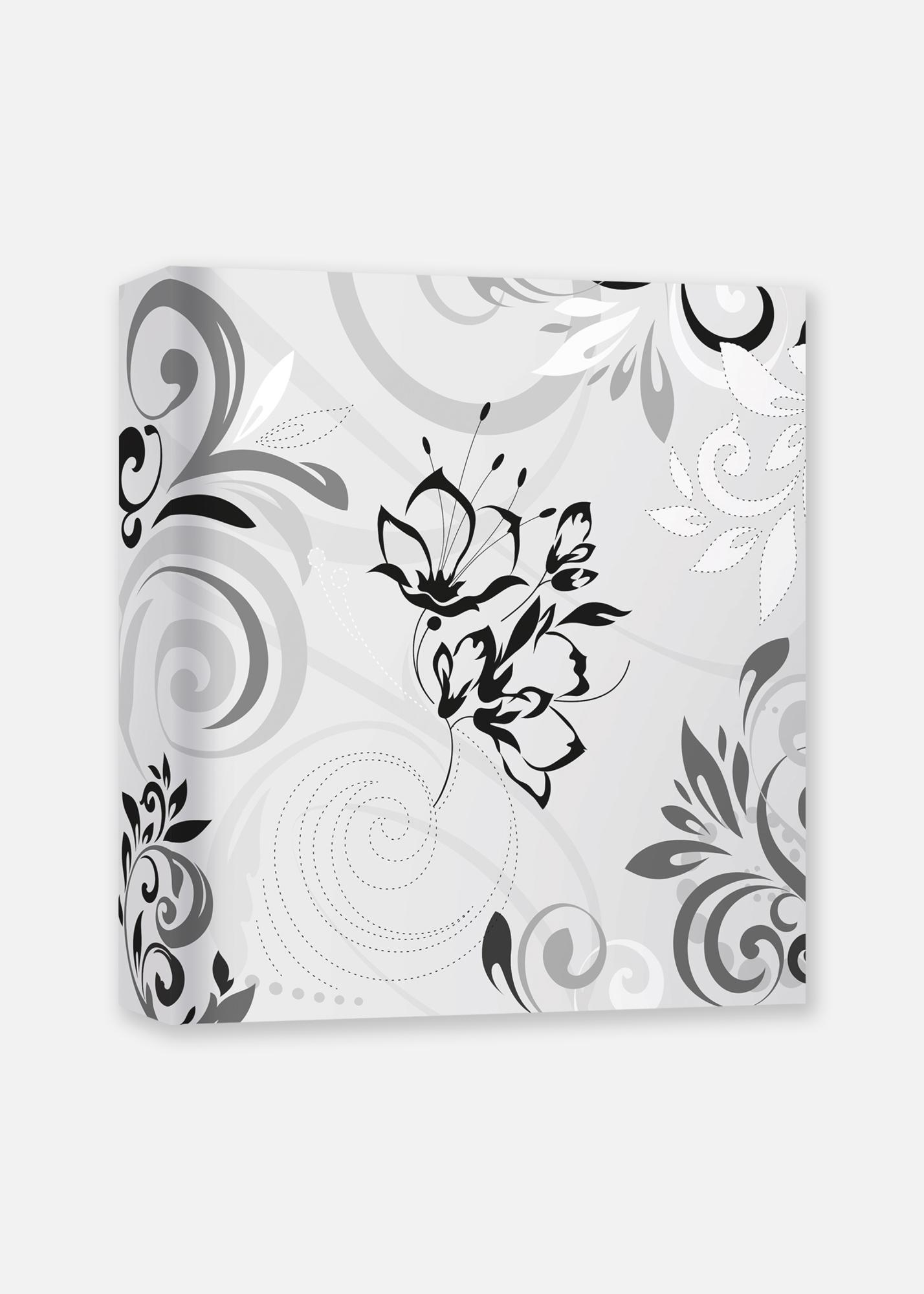 Den vita pärmen är försedd med dekorativa blommönster i grått och svart, vilket även gör detta album till en vacker inredningsdetalj.