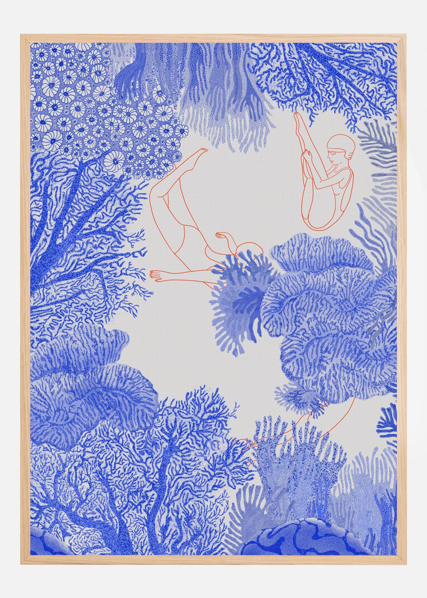 Denna poster fångar en drömlik undervattensvärld med eleganta linjer och dämpade färger. Motivet består av två abstrakt tecknade figurer i rörelse, omgivna av detaljerade illustrationer av korallrev och havsväxter. De mjuka, organiska formerna ger en känsla av lugn och harmoni, perfekt för att ge ditt rum en avslappnande atmosfär.