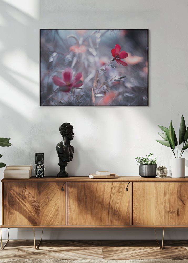 Denna poster fångar en drömlik trädgårdsscen med en ljuvlig blomma i centrum. Det mjuka fokus och de svävande blommorna ger ett magiskt och nästan eteriskt intryck. Färgskalan domineras av djupa röda och rosa toner som smälter samman med subtila nyanser av grått och blått, vilket skapar en lugnande och harmonisk atmosfär. Detta print är perfekt för att tillföra en touch av natur och elegans till ditt hem.