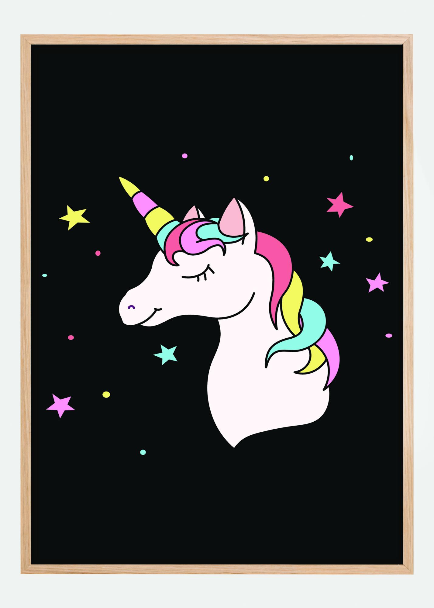 En söt poster med en barnslig vit enhörning på en svart bakgrund. Enhörningen har en rosa, gul och turkos man och horn. Stjärnor i samma färger fyller den svarta bakgrunden bakom för att skapa en rolig stämning värdig en prinsessa. Häng den här i barnkammaren för att få en rolig, udda bild som uppmuntrar barnens fantasi.