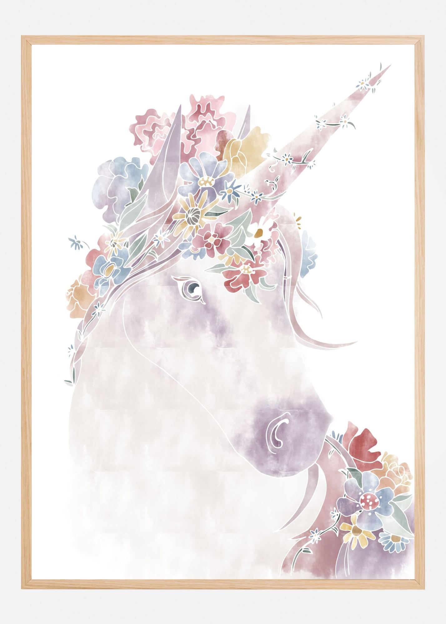 Denna drömska poster innehåller ett motiv av en stiliserad enhörning, vars konturer och mjuka former är framhävda i ett subtilt vattenfärgsliknande uttryck. Det magiska kreaturet är prytt med en krans av blommor vilket tillför en fantasifull och lekfull touch till konstverket. Denna affisch är ett perfekt val för den som önskar tillföra en dos av mystik och saga till sitt hem.