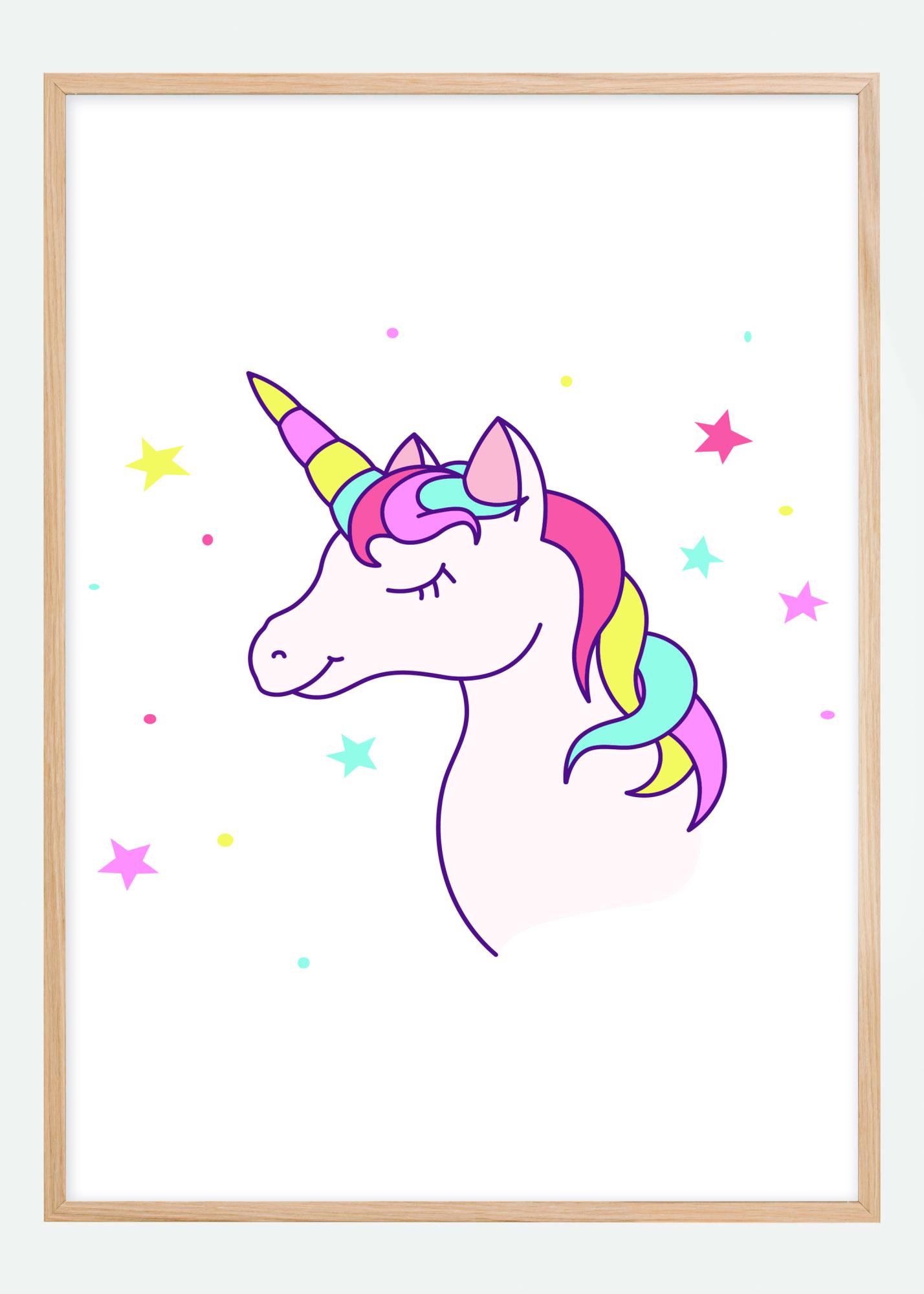 En finurlig poster med en enhörning med slutna ögon på en vit bakgrund. Enhörningen har en gul, blå och rosa man och horn. Det finns också stjärnor i samma färger som är utspridda bakom och skapar en söt magisk bild. Den är perfekt i en barnkammare, eftersom det är en enkel rolig teckning.