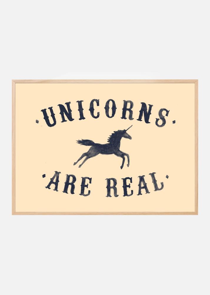 Denna charmiga poster framhäver ordet "UNICORNS ARE REAL" i stiliga, vintage-inspirerade typsnitt, vilket gör den till ett iögonfallande tillskott för den som vill tillföra en touch av magi och fantasi till sitt hem. Mörka toner av svart används för texten och enhörningen, vilket står i stark kontrast till den varma beige bakgrunden, vilket bidrar till ett klassiskt och tidlöst utseende.