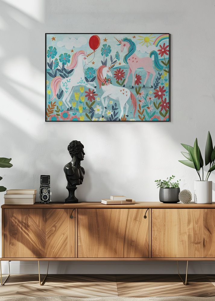 Denna magiska poster fångar ögat med sina lekfulla enhörningar och färgglada blommor. Två vita enhörningar och en rosa enhörning med regnbågsfärgad man utforskar en förtrollad äng. De omges av en rik mångfald av blommor i blått, gult och rött, vilket skapar en livfull känsla i motivet. Den röda ballongen ger en extra touch av fantasi och lekfullhet.