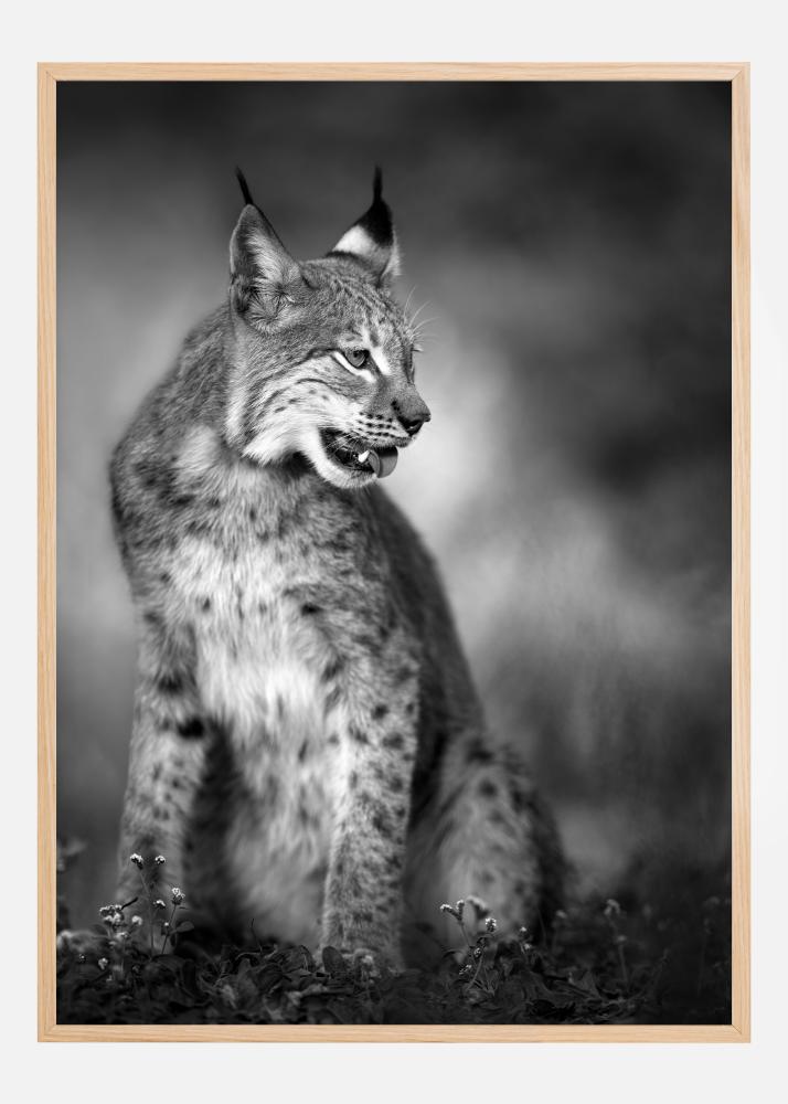 En djurlivsposter med ett lodjur som sitter i gräset. Katten tittar åt höger i bilden och ser kanske på ett potentiellt byte. De ljusa fläckarna i pälsen och tofsarna på öronen sticker ut i tydliga detaljer. Häng det här svartvita trycket på en grön vägg för en naturlig känsla.
