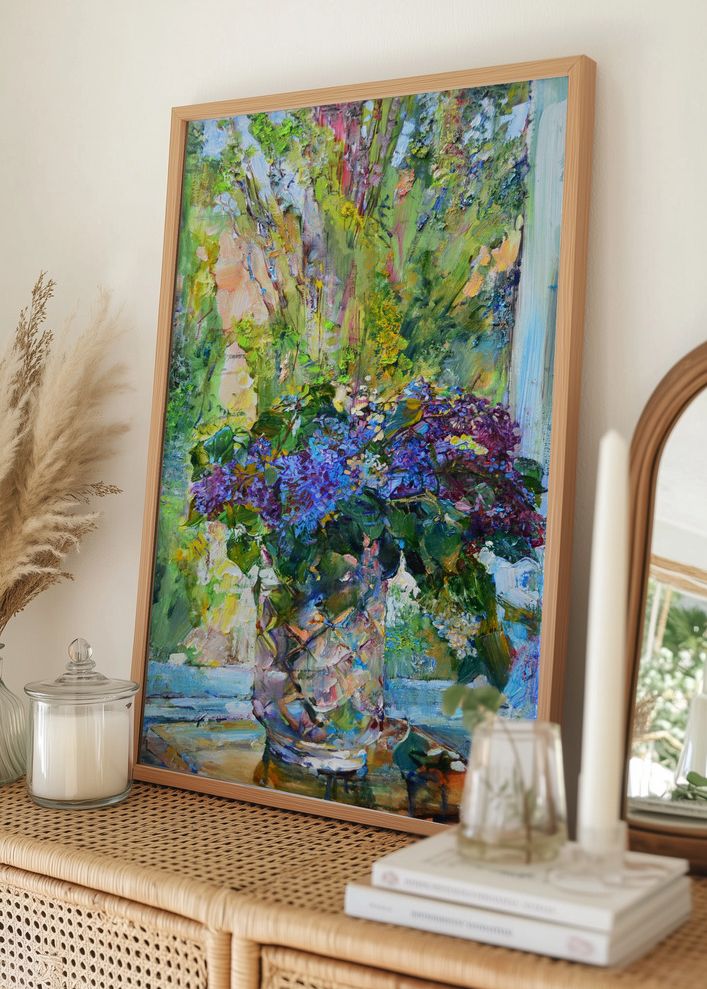 Denna eleganta poster visar en livlig och färgstark bukett i en vas, vilket ger en känsla av fräschhet och natur inomhus. Konstverket fångar uppmärksamheten med sina rika detaljer och skapar en harmonisk balans mellan de olika färgnyanserna. Buketten består av blommor i djupa lila toner, kompletterad av kontrasterande gröna blad, vilket ger en känsla av djup och dynamik i affischen.
