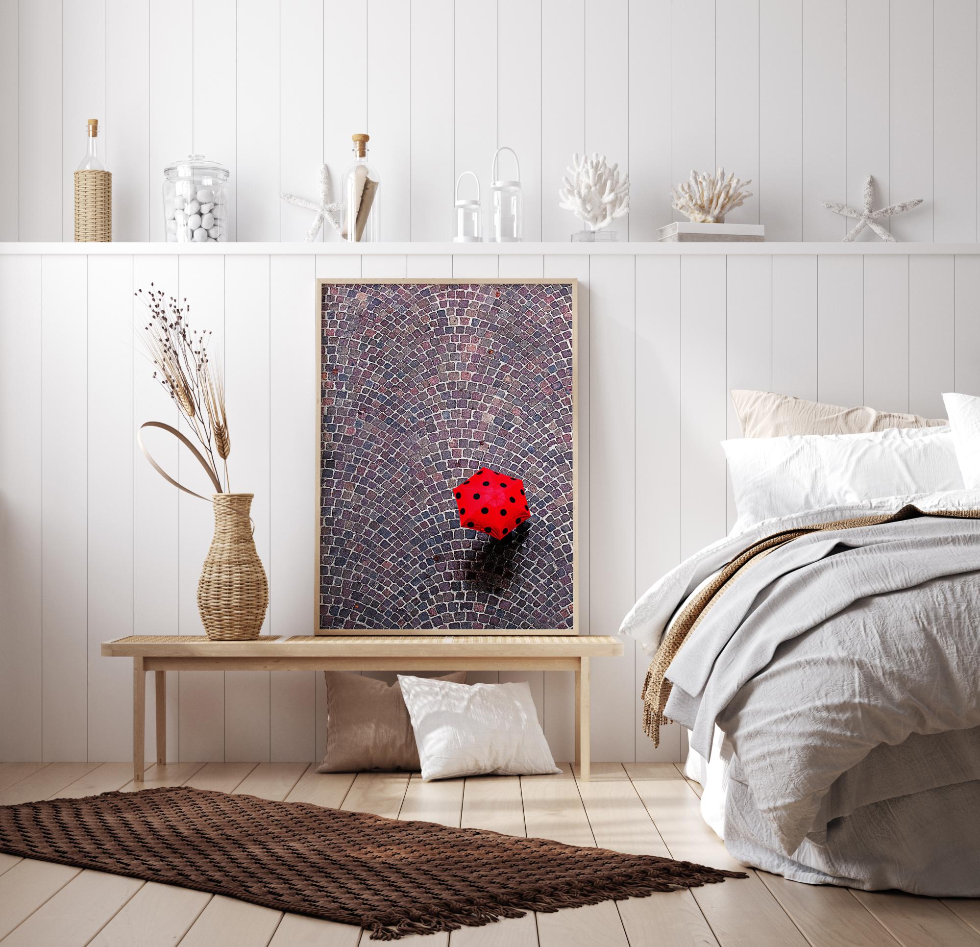En urban poster med en trottoar i fågelperspektiv. Ett klarrött paraply med svarta fläckar skapar en ljus punkt i det blå och lila mosaikgolvet. Paraplyet som ser ut som en nyckelpiga skapar en rolig fokuspunkt i den här mönstrade och tessellerande bilden.