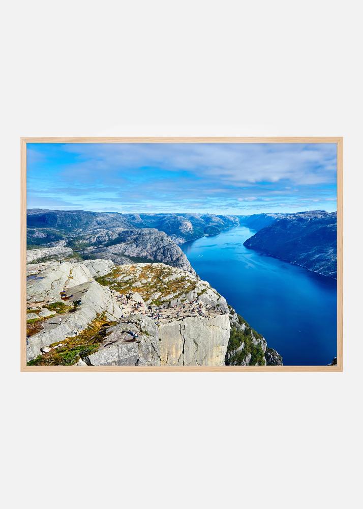 Fotografi med milsvid hisnande utsikt över en djup fjorddal. Postern går i havsblåa toner med solbelysta kala klippor på båda sidor om fjorden, ett storslaget landskap som passar på väggen hos den som uppskattar ett vackert natursceneri. Komplettera bilden med en tavelram som framhäver motivet.
