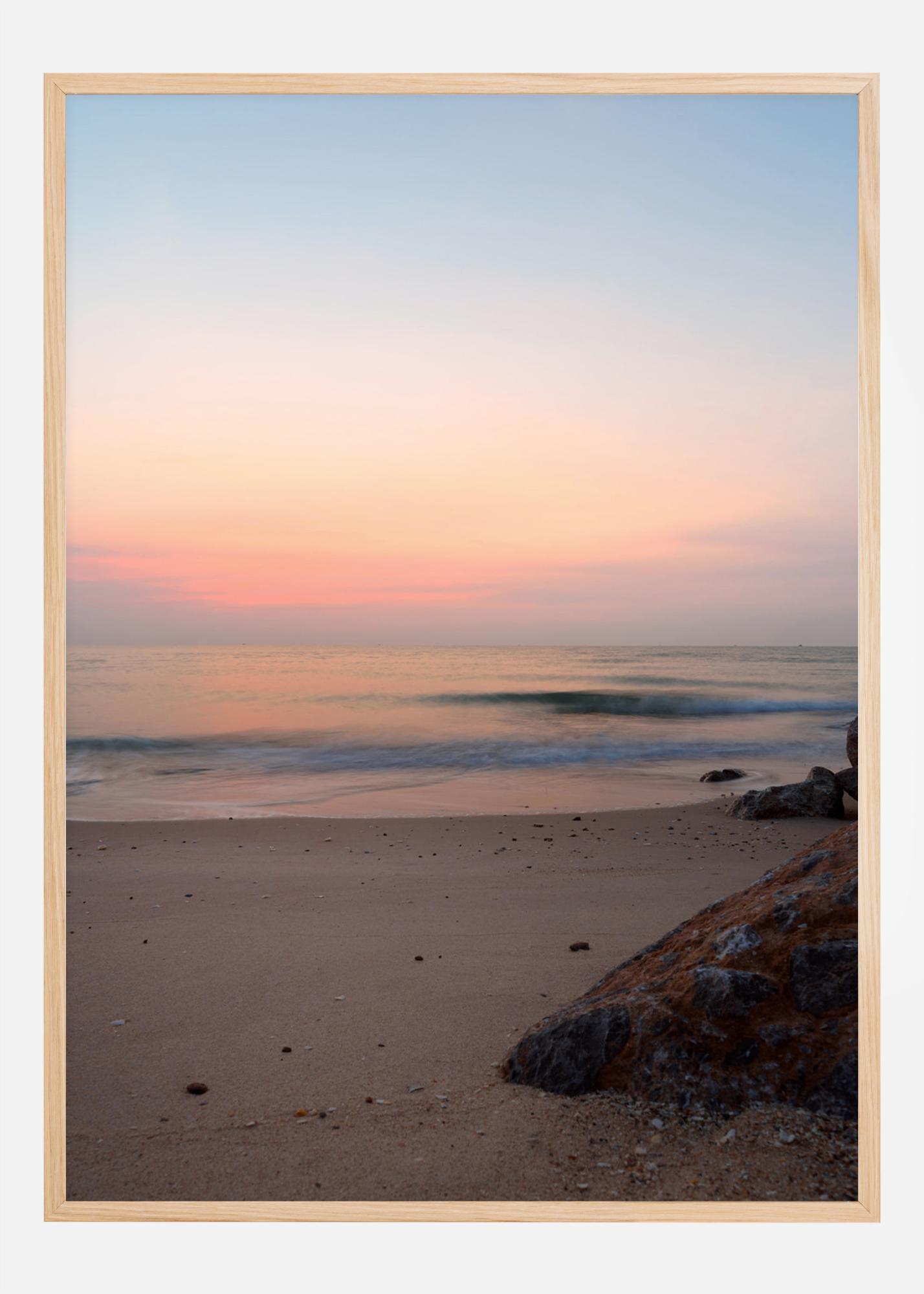 En poster med en bred sandstrand och det lugna havet i bakgrunden. En mjuk soluppgång tittar fram över horisonten och kastar ett mjukt rosa och blått sken över havet. Få semesterkänsla med denna lugna och fridfulla strandscen.