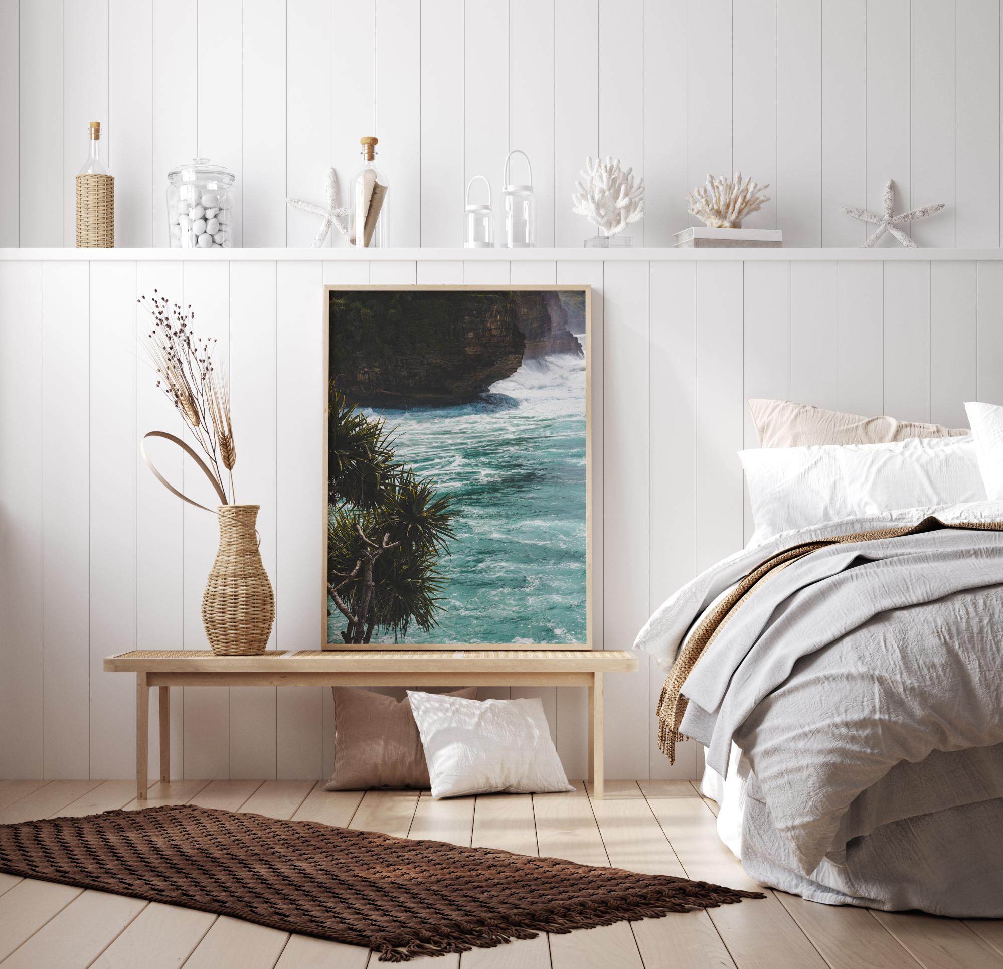 En tropisk poster med havet som slår mot klippornas botten. En grupp palmer blåser i vinden till vänster om bilden för att ge den en mer exotisk känsla. Känn värmen i denna ljusblå scen och föreställ dig din perfekta semester.