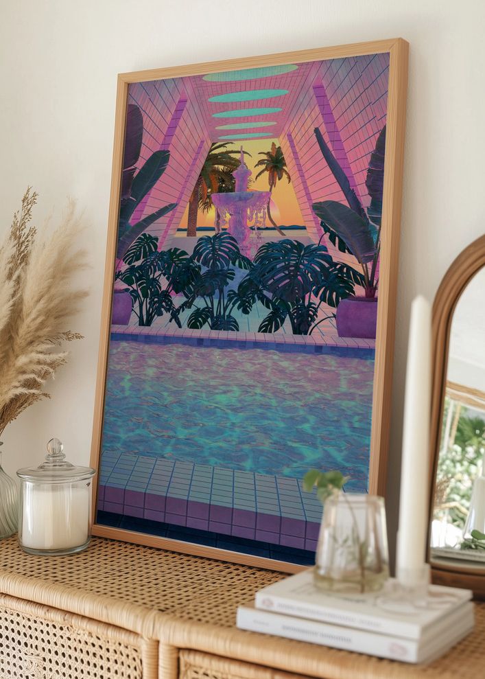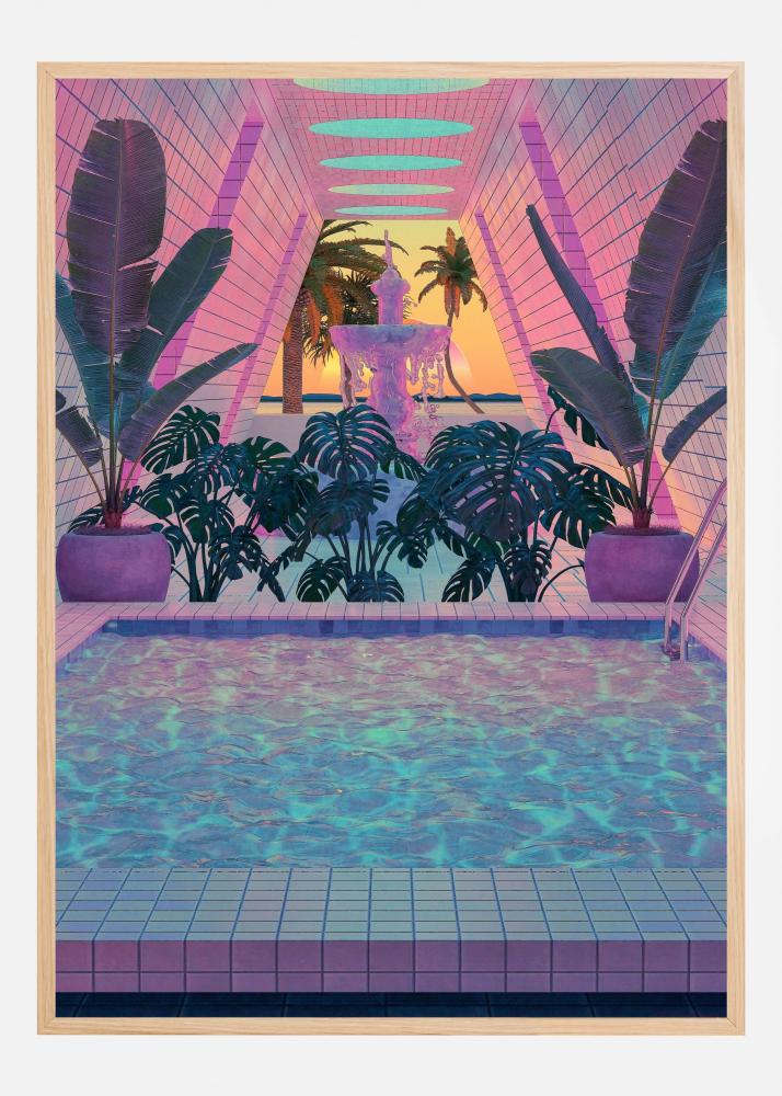 Denna poster fångar en drömsk och tropisk atmosfär, perfekt för att ge ditt hem en touch av exotisk elegans. Motivet visar en inomhuspool omgiven av stora, frodiga palmblad och trolskt upplysta växter som speglar sig i vattnet. Den dynamiska färgpaletten inkluderar livfulla nyanser av rosa, lila och blått, vilket ger affischen en fängslande estetik.