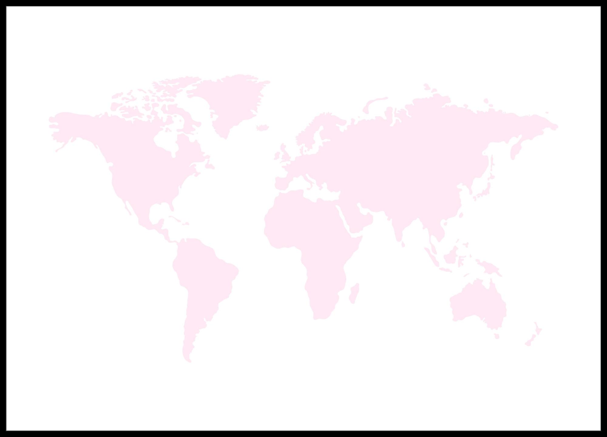 Grafiskt tryck för den världsliga eller globetrottern som vill skryta. En enkel kartillustration med en stiliserad världskarta i rosenrosa färg mot vit bakgrund. Passar lika bra in i alla hemmets rum. Placera postern tillsammans med andra tavlor på temat resa eller använd för att markera alla platser du har besökt runt om i världen.